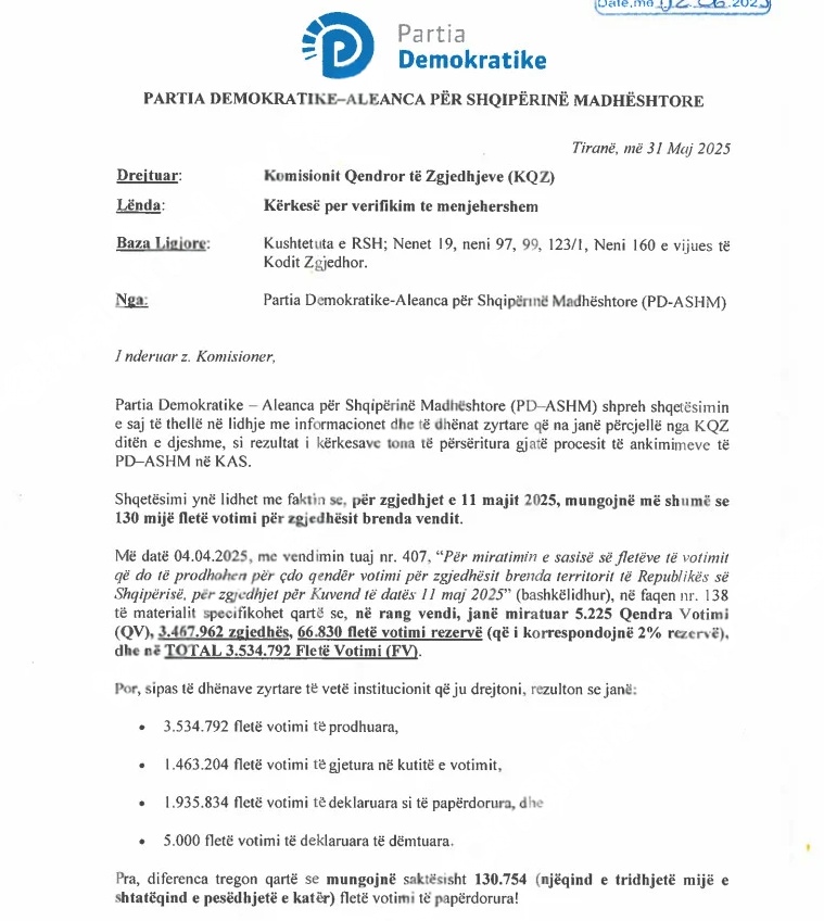 Partia Demokratike e cila nuk e njeh rezultatin e dalë nga zgjedhjet e 11 Majit, tani i është drejtuar sërish Komisionit Qendror të Zgjedhjeve. Sipas kërkesës, PD thotë se mungojnë më shumë se 130 mijë fletë votimi për zgjedhësit brenda vendit. Po ashtu opozita kërkon nisjen e një hetimi administrativ nga ana e KQZ-së si dhe verifikimin e përmbajtjes së fletëve të votimit në të gjitha kutitë në rang vendi.