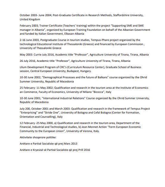 2003-2008: Grade shkencore në Ekonomi Turizmi në Staffordshire University, Angli. Më 2 nëntor 2010 ka marrë titullin Akademik “Profesor i Asociuar” Universiteti Aleksander Moisiu Durres.