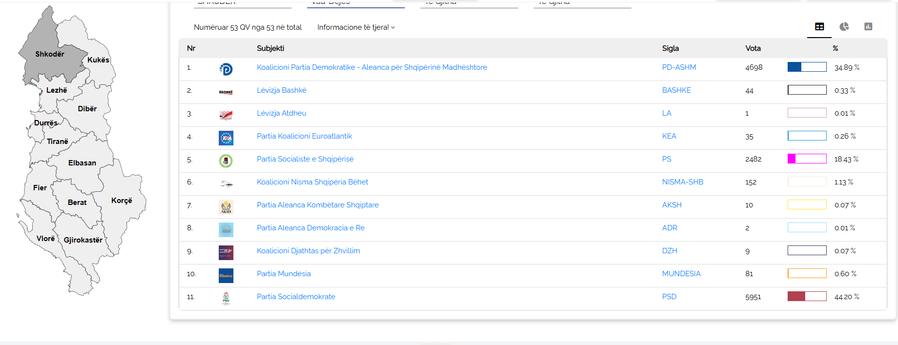 Numërimi edhe në Vaun e Dejës ka përfunduar, ku janë numëruar 53 nga 53 kuti dhe çdo gjë është vendosur. Forcë e parë në këtë bashki të Shkodrës është shpallur Partia Social-Demokrate me 5951 vota, ndërsa Partia Demokratike ka grumbulluar 4698. Në vendin e tretë është renditur Partia Socialiste me 2482 vota. Vau i Dejës është bashkia e parë në të cilën fituese nuk është shpallur as Partia Demokratike e as Partia Socialiste.