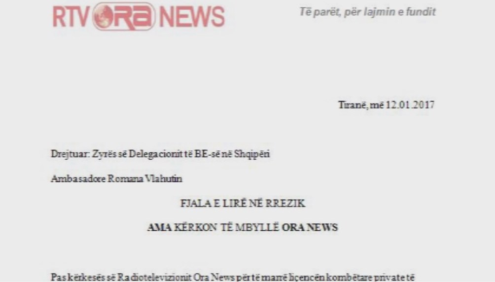 Përmes kësaj letre, Ora News ngre shqetësimin e fjalës së lirë e vënë në shënjestër nga interesa klienteliste që kanë krijuar monopol në tregun audioviziv.