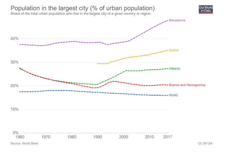 Ndër vendet e rajoni, Maqedonia ka përqindjen më të lartë të popullsisë urbane të vendosur në qytetin më të madh të vendit, me gati 50% të popullsisë. Më pas ndiqet nga Serbia, ku në2017-n, rreth 35.2% e popullsisë urbane ishte e përqendruar në qytetin më të madh të vendit.