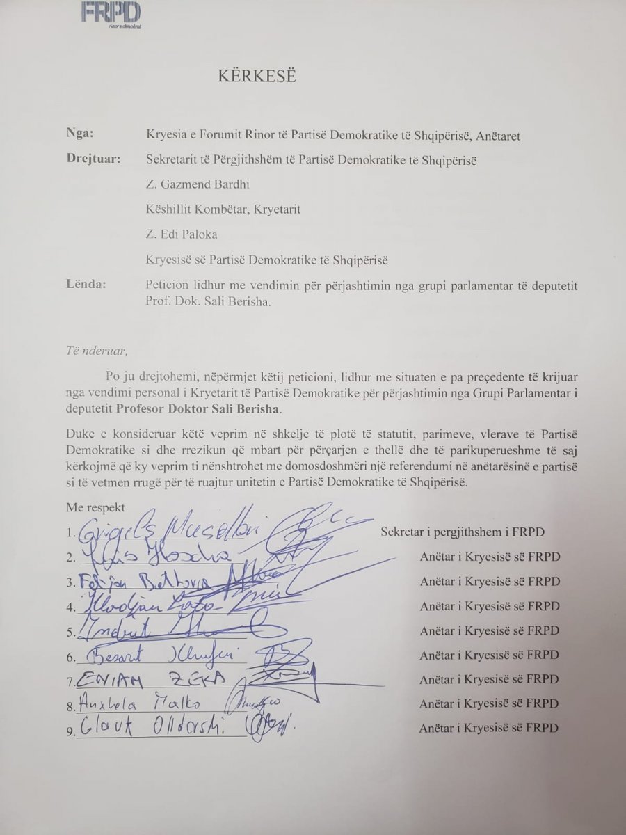 Nuk ka qetësi në selinë blu në Tiranë. Sot FRD, organizata kryesore e rinisë së PD-së, kërkon Referendum partiak për vendimin e Lulzim Bashës për përjashtimin e ish-liderit Berisha.