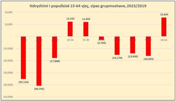 Rënien më të fortë shihet ta ketë grupmosha 20-24 vjeç, me më shumë se 17% që nga viti 2019. Rënia në këtë grupmoshë reflekton emigracionin e lartë të të rinjve jashtë vendit. Më tej, rënie të madhe ka pësuar popullsia në moshën 15-19 vjeç, kur në vitin 2023 numërohen 35 mijë persona më pak se, në vitin 2001.