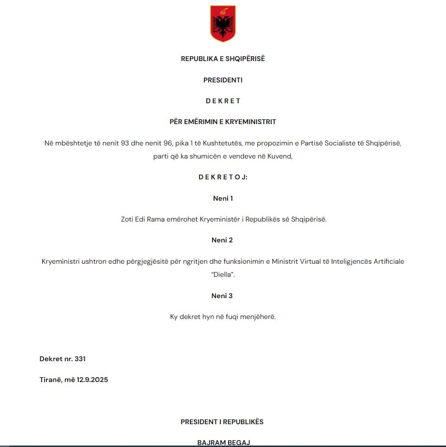 Presidenti Bajram Begaj ka dekretuar Edi Ramën si kryeministër. Sakaq sot pasdite në orën 17:00 pritet të bëhet betimi i 140 deputetëve të Kuvendit.