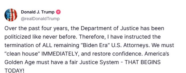 “Gjatë katër viteve të fundit, Departamenti i Drejtësisë është politizuar si kurrë më parë. Prandaj, kam udhëzuar shkarkimin e të gjithë prokurorëve të mbetur të “Epokës Biden” në SHBA. Ne duhet të “pastrojmë shtëpinë” dhe të rivendosim besimin. Epoka e Artë e Amerikës duhet të ketë një sistem drejtësie të drejtë dhe të ndershëm që fillon sot”, shkruan Trump në Truth.