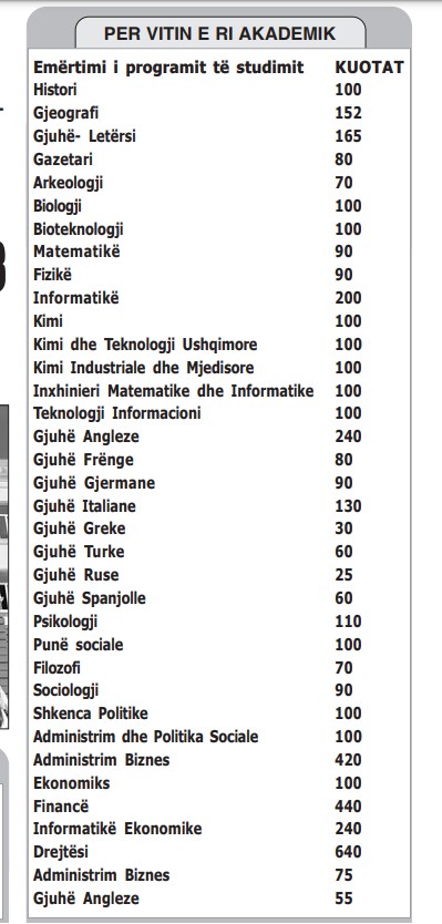 Ulje drastike me 70 pranime më pak, ka pësuar Gazetaria, Arkeologjia dhe Gjeografia. Në Fakultetin e Shkencave Sociale, e vetmja degë ku është vënë dorë është Filozofia, e cila do të ofrojë për vitin e ardhshëm akademik dhjetë vende më pak se vitin e kaluar.