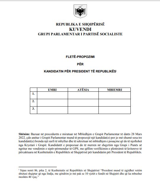 Lajmin e njoftoi sot në një prononcim për mediat, kreu i grupit parlamentar të PS, Taulant Balla, ndërsa tha se çdo deputet socialist do të propozojmë jo më shumë se tre 3 si kandidatë për kreun e ri të shtetit. Më poshtë gjeni fletë-propozimin, i cili do të plotësohet nga ligjvënësit socialistw, e më pas do të dorëzohet në zarf në Kryesinë e kuvendit.