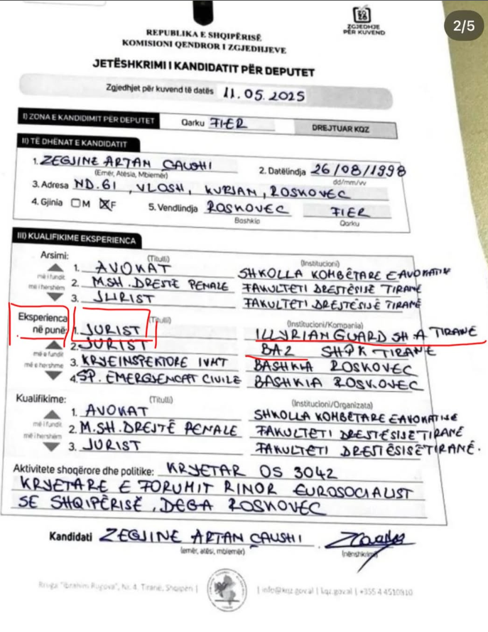 Deputetja e PS-së, Zegjine Çaushi ka publikuar CV e saj ndër vite, si dhe ka sqaruar pozicionin e saj të punës në kompaninë “Illyrian Guard”. Ajo shprehet se pranë kësaj kompanie ka pasur rolin e juristes, ndërsa sqaron se çdo pagesë që ka marrë ndër vite në vendet e punës që ka qenë është e deklaruar.
