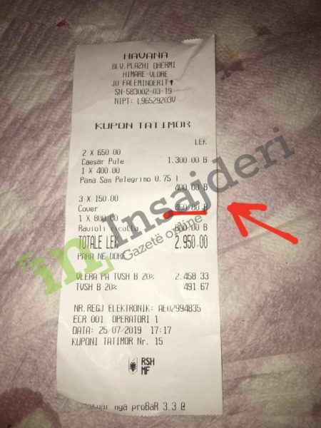Turisti nga Kosova pa dashur të prononcohet ka treguar për Gazetën Insajderi se ka paguar 450 Lekë për tri karrige, ku në total fatura e tij kishte kushtuar 2.950.00 Lekë.