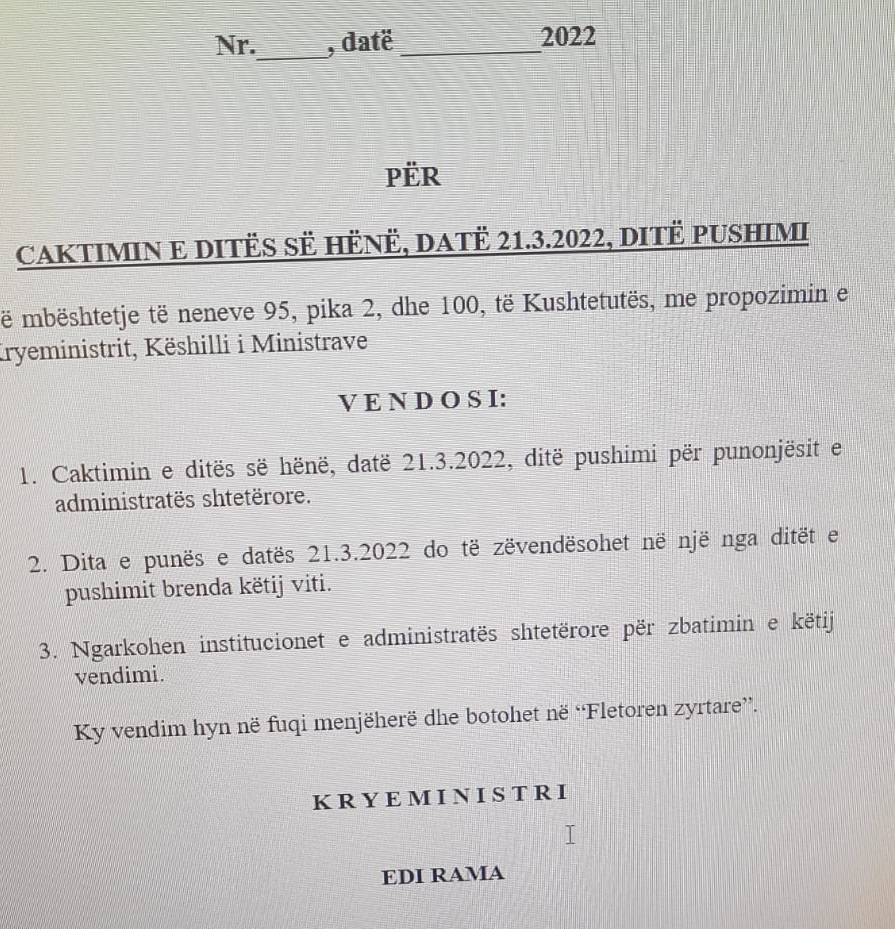 Sipas vendimit, kjo ditë pushimi do të zëvendësohet me një ditë tjetër pushimi gjatë vitit në vijim.