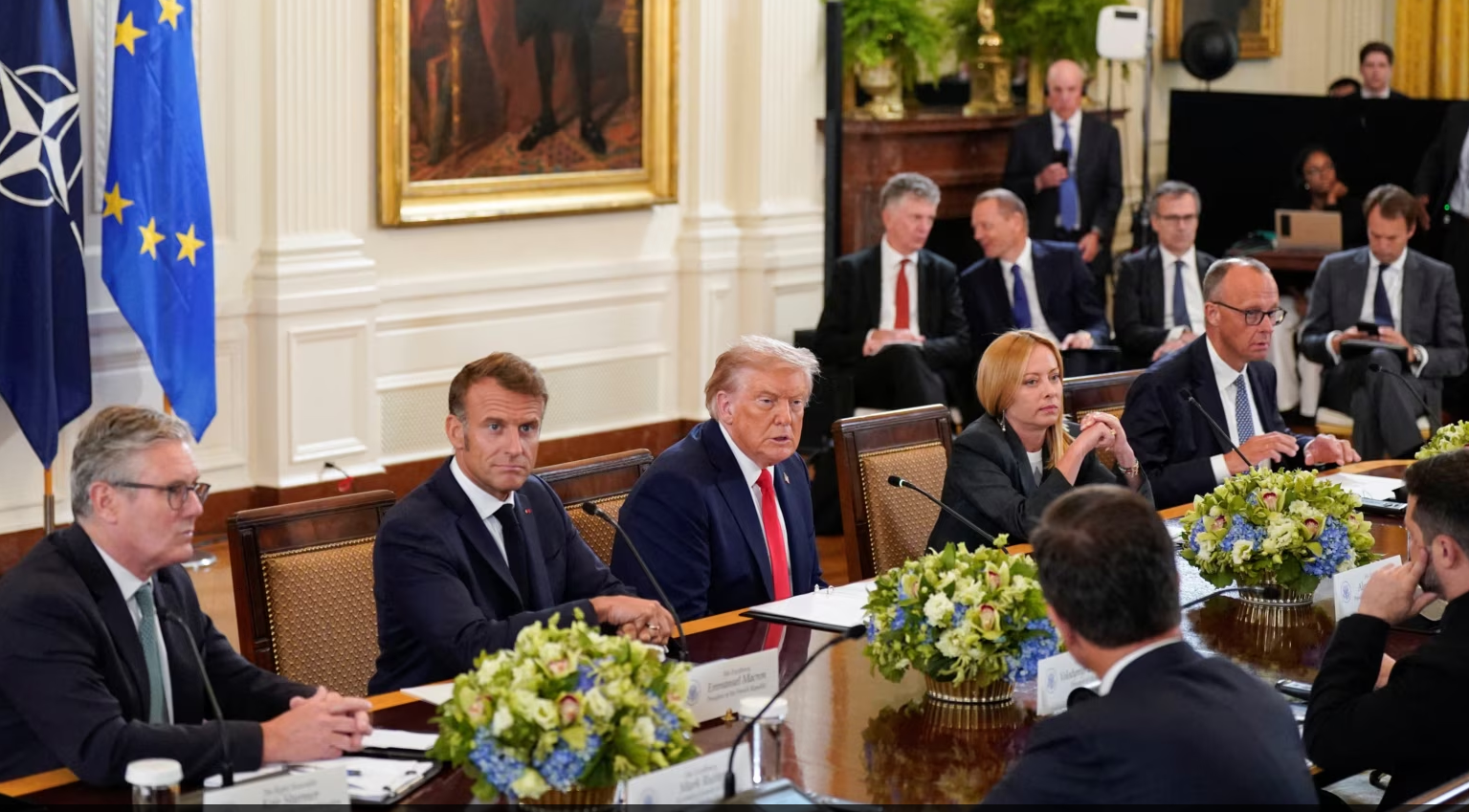 Trump u takua fillimisht me Zelenskyn në takim dypalësh dhe pastaj i priti në një takim shumëpalësh liderin ukrainas, shefin e NATO-s Mark Rutte, presidentin francez Emmanuel Macron, kryeministrin britanik Keir Starmer, kancelarin gjerman Friedrich Merz, kryeministren italiane Giorgia Meloni, presidentin finlandez Alexander Stubb, dhe presidenten e Komisionit Evropian Ursula von der Leyen.