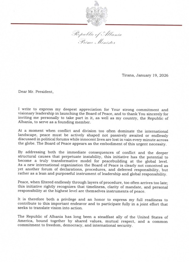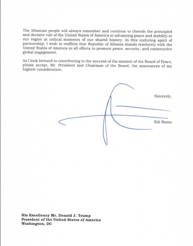 Kryeministri Edi Rama i ka nisur në letër presidentit të SHBA-së, Donald Trump, në përgjigje të ftesës së tij për të marrë pjesë në Bordin e Paqes.
