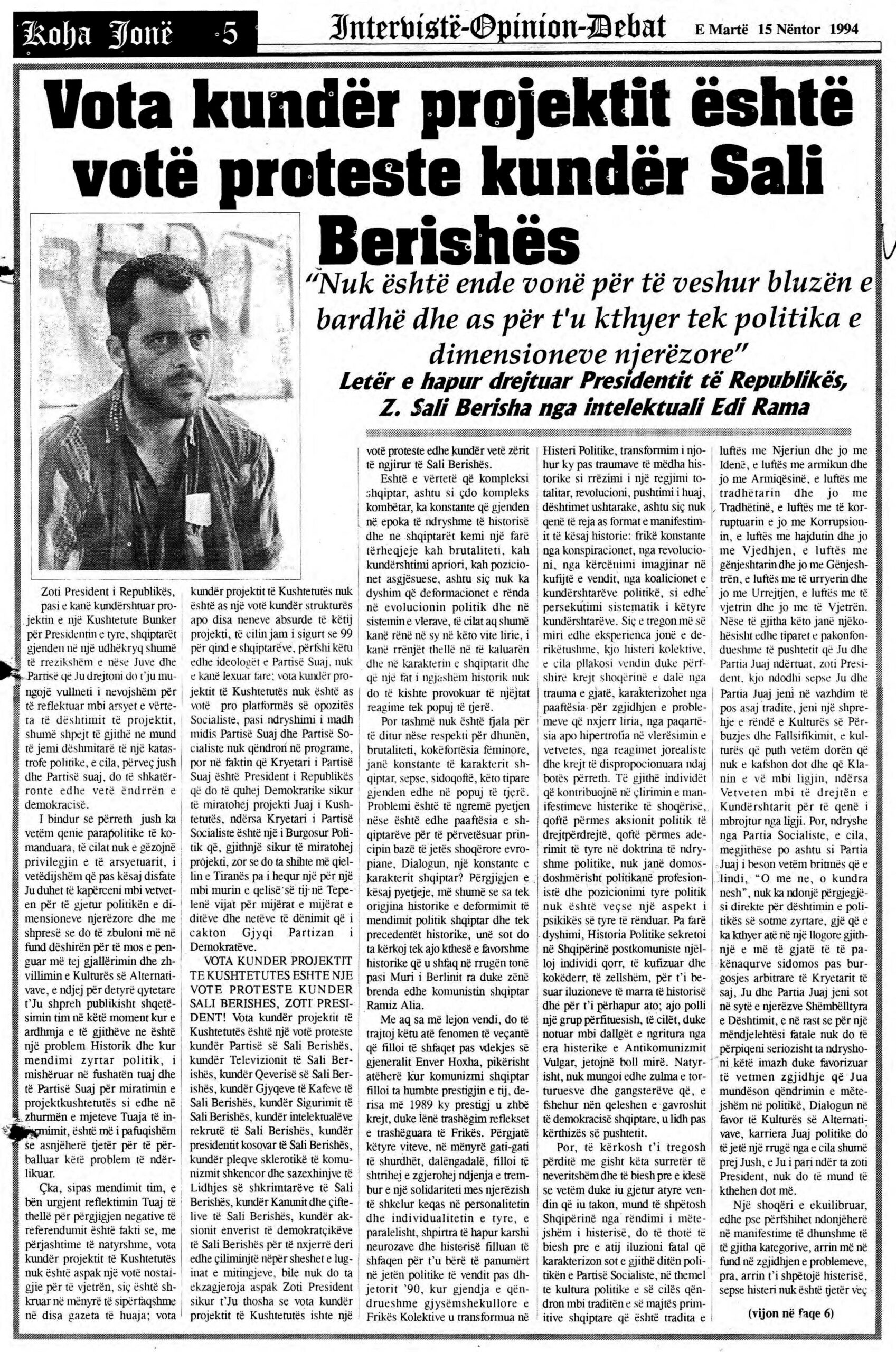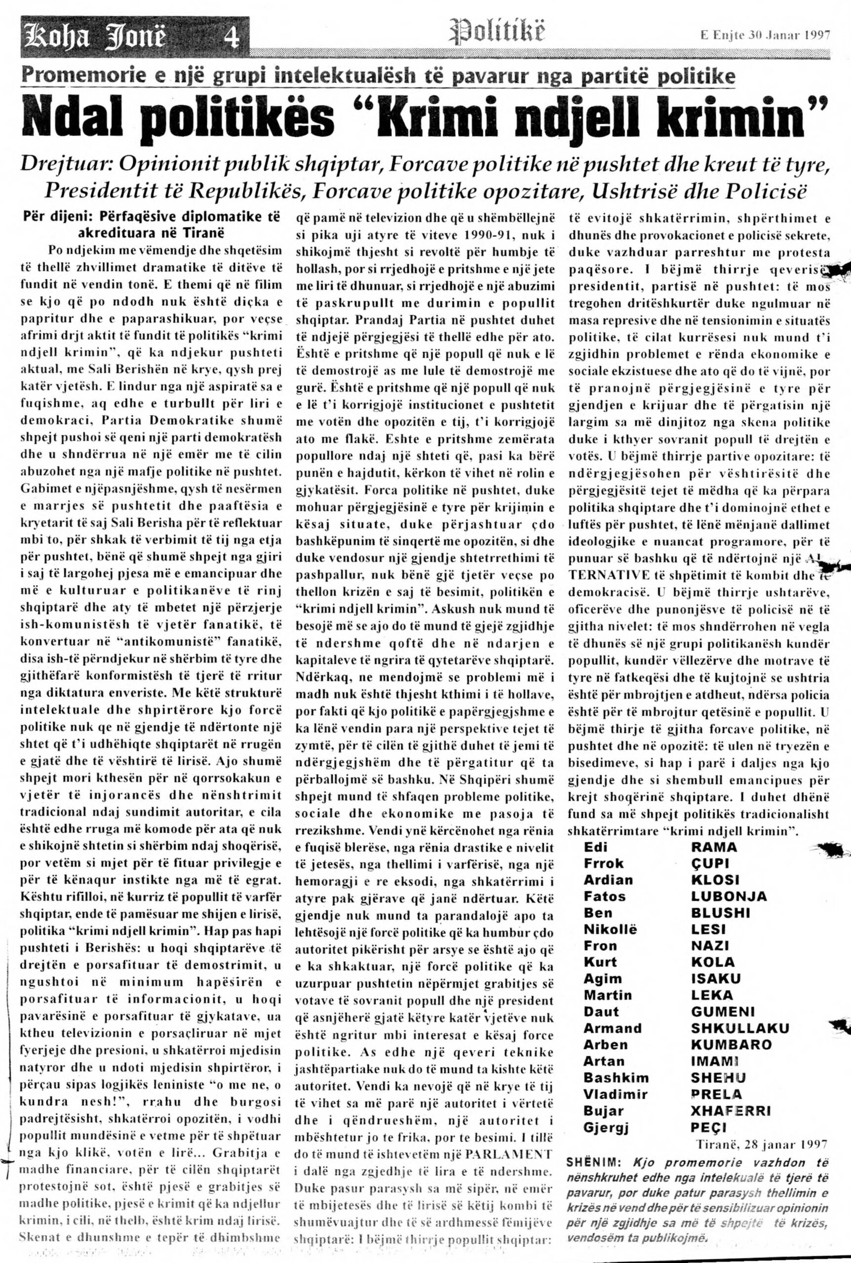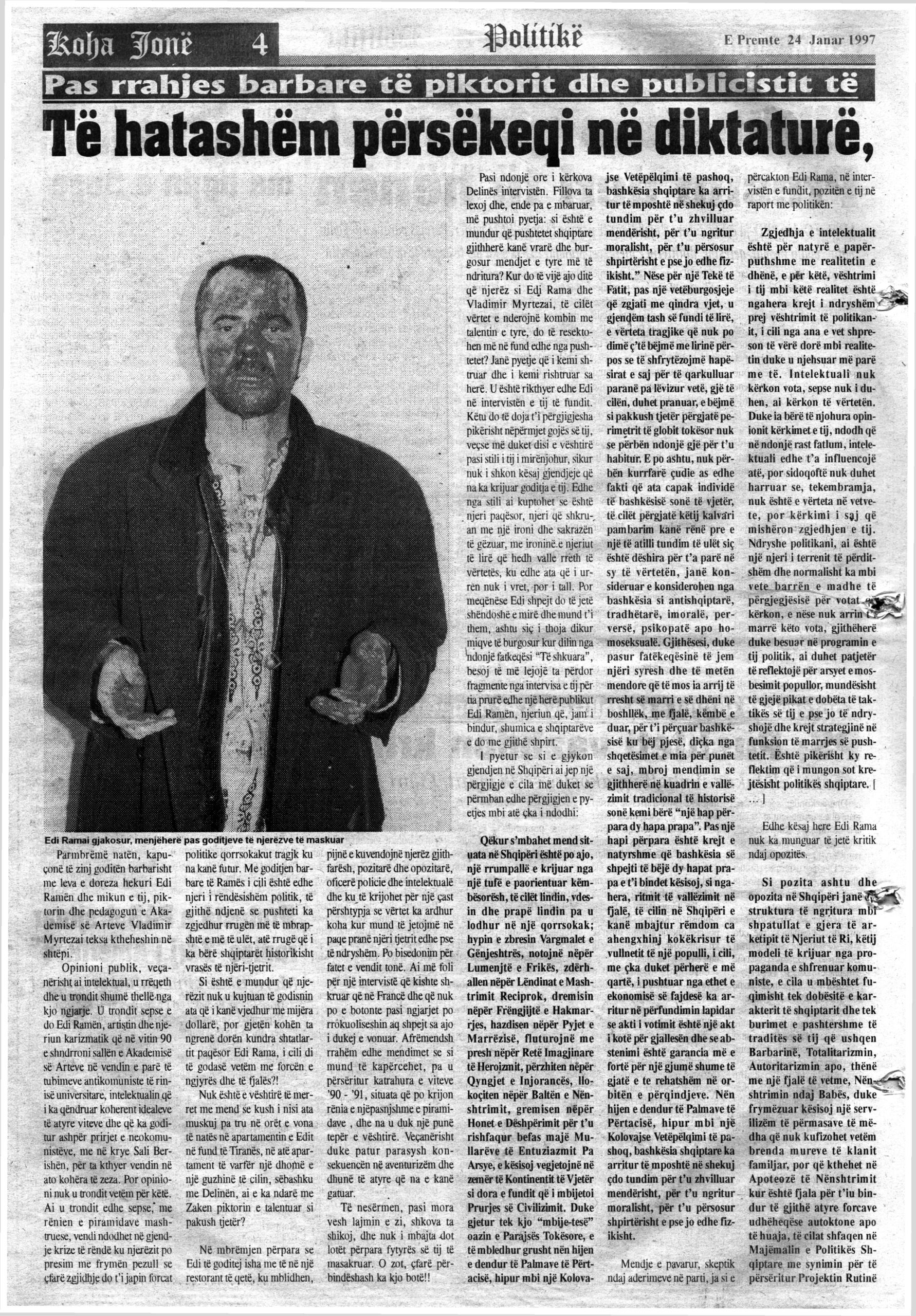 Edi Rama ishte në shënjestër të regjimit të Presidentit të asaj kohe, Berisha për shkak të artikujve në gazetën Koha Jone si dhe qëndrimit të tij prej intelektuali kurajoz pasi ndërmori në janar 1997 një fushatë me një peticion ku i bënte thirrje Presidentit, kryeministrit dhe politikës të ishin njerëzore dhe të kuptonin popullin e tyre e jo të përdornin dajakun.