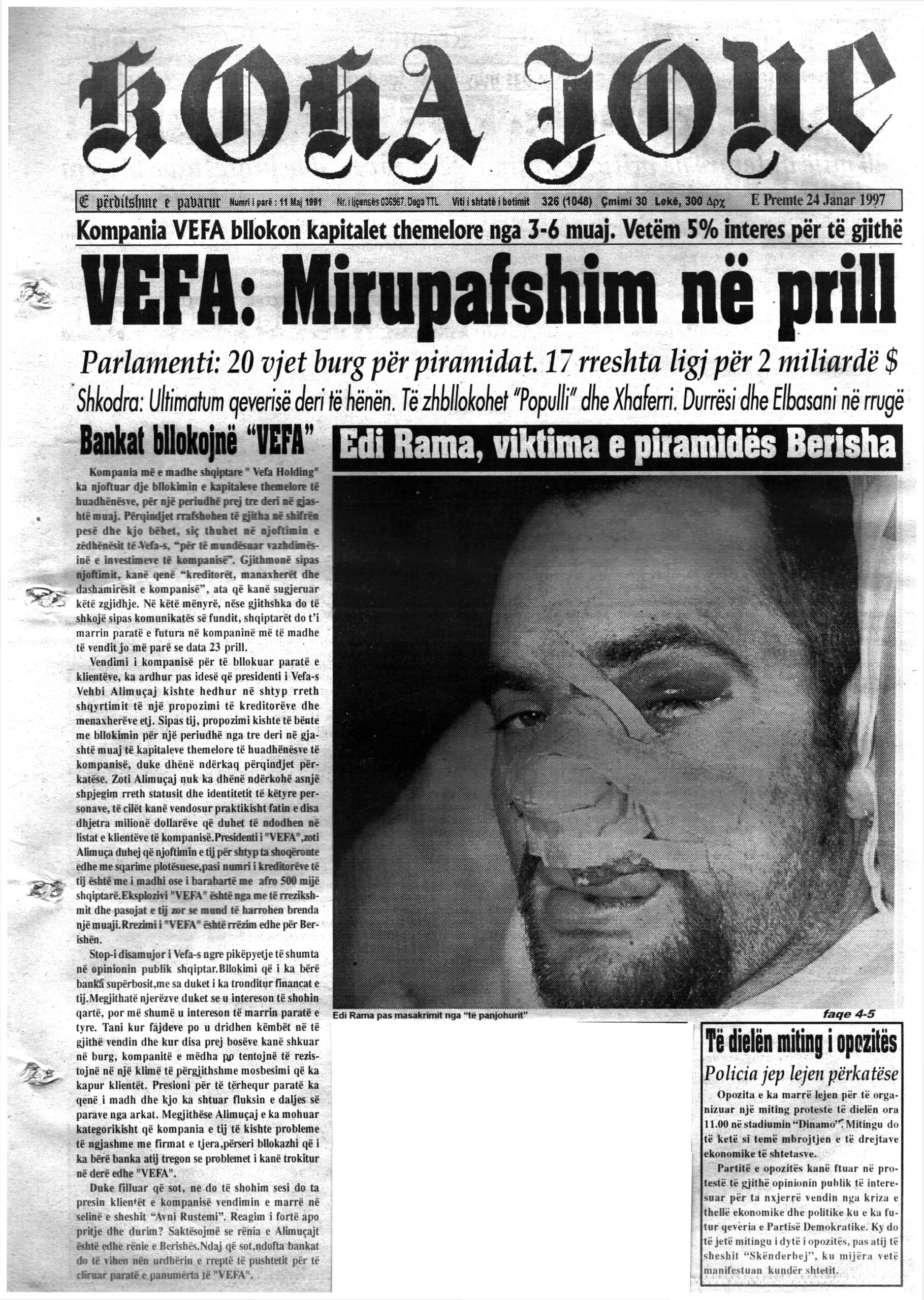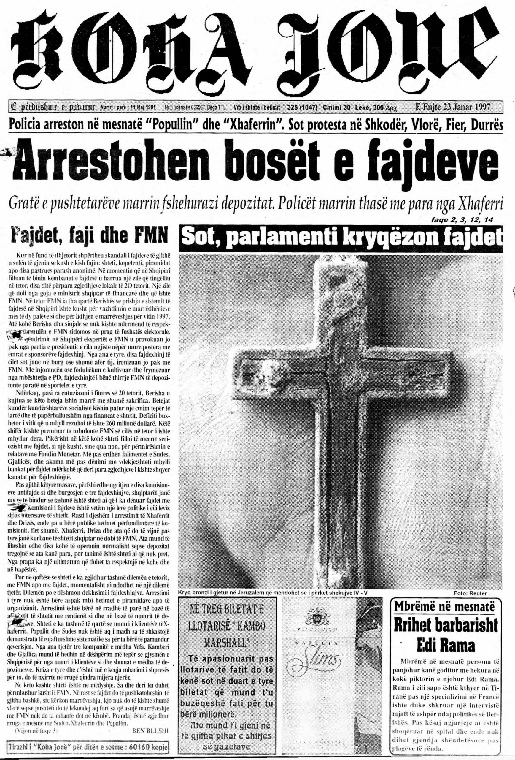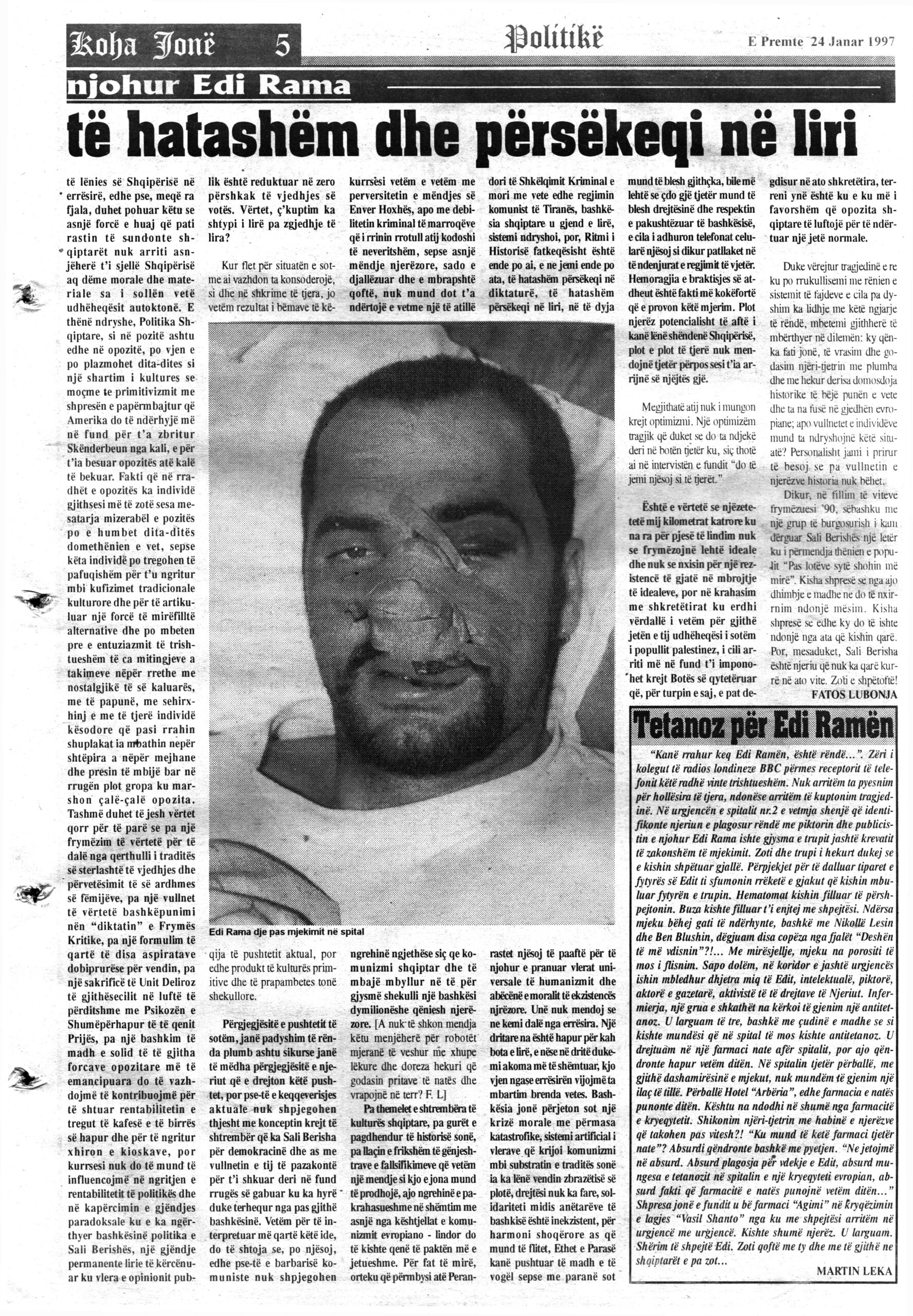 Kryeministri Edi Rama përgjatë një interviste të dhënë për Stephan Lebert dhe Stefan Willeke publikuar në median gjermane “Die Zeit”, ka rrëfyer, ndër të tjera, edhe kujtimet nga sulmi në janar të vitit 1997. Për sulmin e vitit 1997, kreu i qeverisë tha se ishte një tentativë vrasjeje. Dhe ashtu ka qenë. Asokohe Edi Rama shkruante për gazetën KOHA JONE. Në ato muaj kur Presidenti Berisha kishte urdhëruar raprezaljen ndaj intelektualëve kritikë dhe gazetës KOHA JONE, Edi Rama ishte në Tiranë duke hartuar një peticion për dorëheqjen e qeverisë në janar 1997, pasi vendi po shkonte drejt kaosit. Peticioni është botuar me 30 janar 1997 në KOHA JONE.