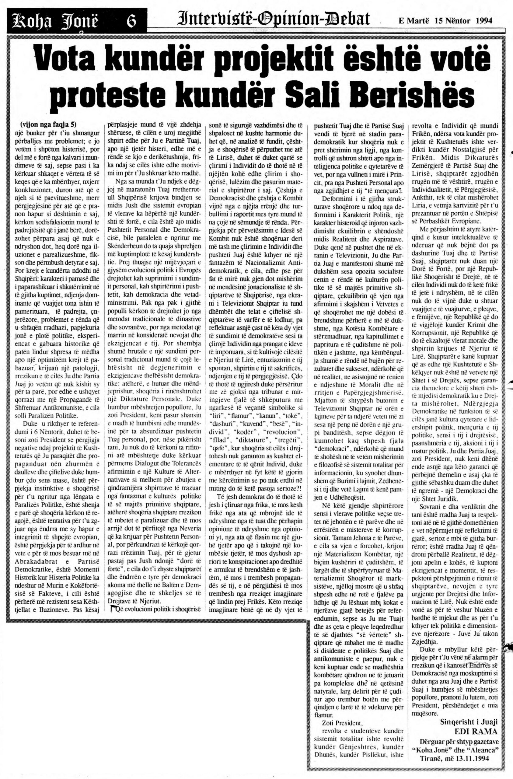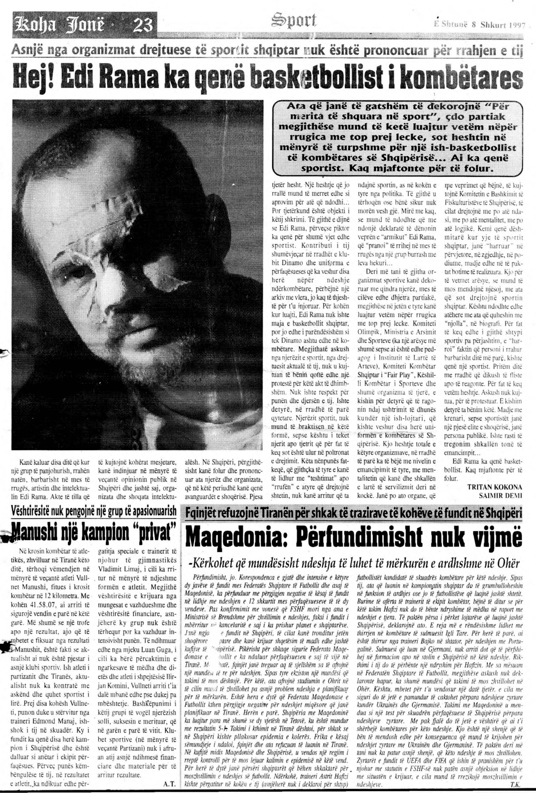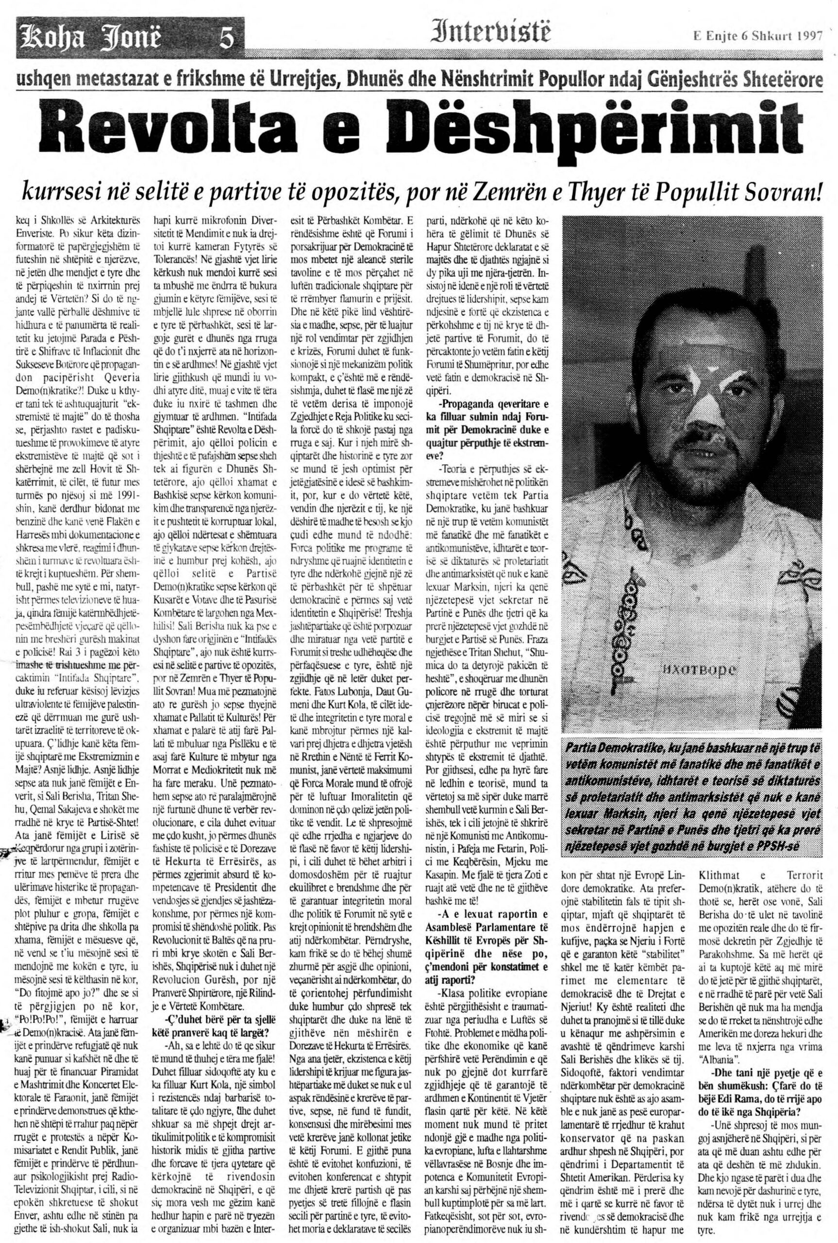 Kryeministri Edi Rama përgjatë një interviste të dhënë për Stephan Lebert dhe Stefan Willeke publikuar në median gjermane “Die Zeit”, ka rrëfyer, ndër të tjera, edhe kujtimet nga sulmi në janar të vitit 1997. Për sulmin e vitit 1997, kreu i qeverisë tha se ishte një tentativë vrasjeje. Dhe ashtu ka qenë. Asokohe Edi Rama shkruante për gazetën KOHA JONE. Në ato muaj kur Presidenti Berisha kishte urdhëruar raprezaljen ndaj intelektualëve kritikë dhe gazetës KOHA JONE, Edi Rama ishte në Tiranë duke hartuar një peticion për dorëheqjen e qeverisë në janar 1997, pasi vendi po shkonte drejt kaosit. Peticioni është botuar me 30 janar 1997 në KOHA JONE.