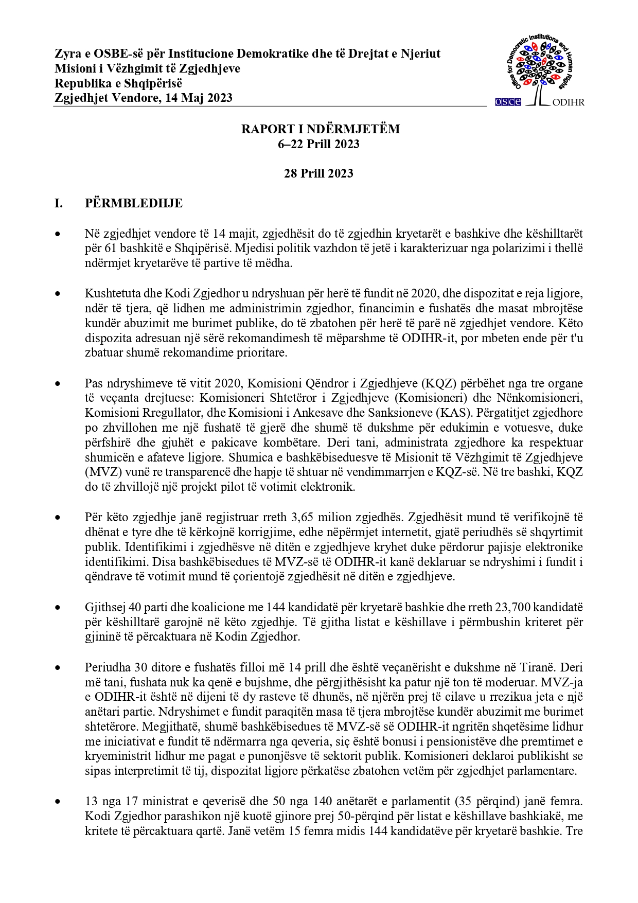 Misioni i OSBE-ODIHR ka përgatitur një raport të parë dhe të ndërmjetëm për klimën e deritanishme të fushatës elektorale për zgjedhjet lokale të 14 Majit. Në raport vihet theksi te fakti se fushata zgjedhore e cila sipas vëzhguesve të huaj ka qenë jo e bujshme dhe me tone të moderuara.