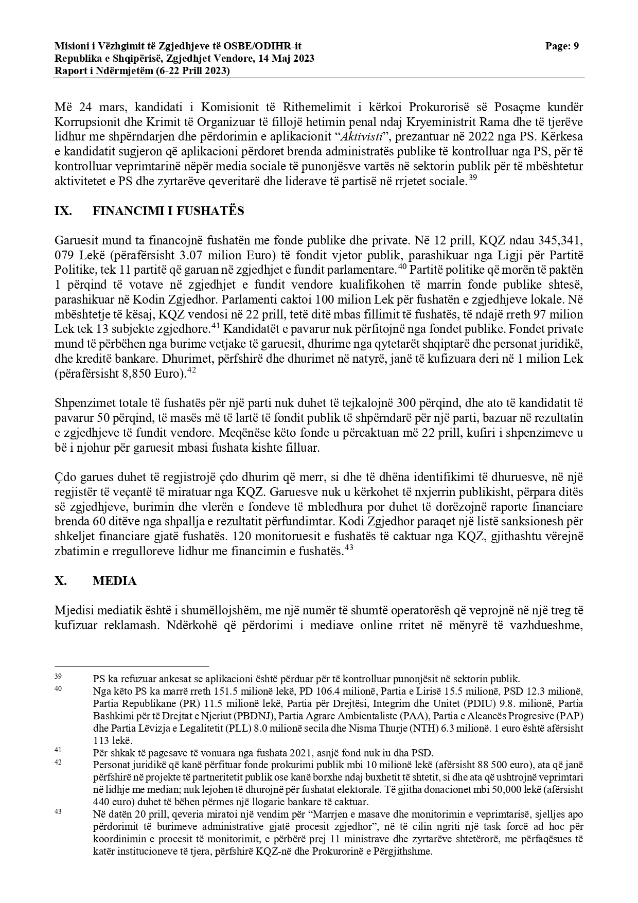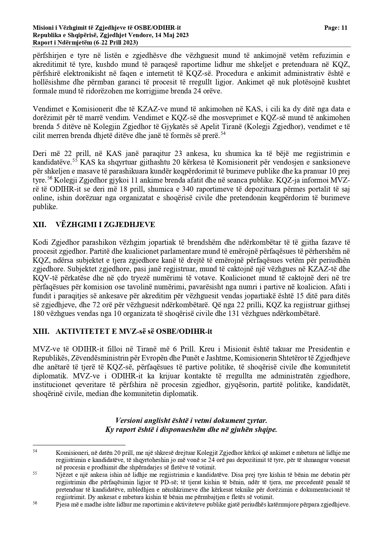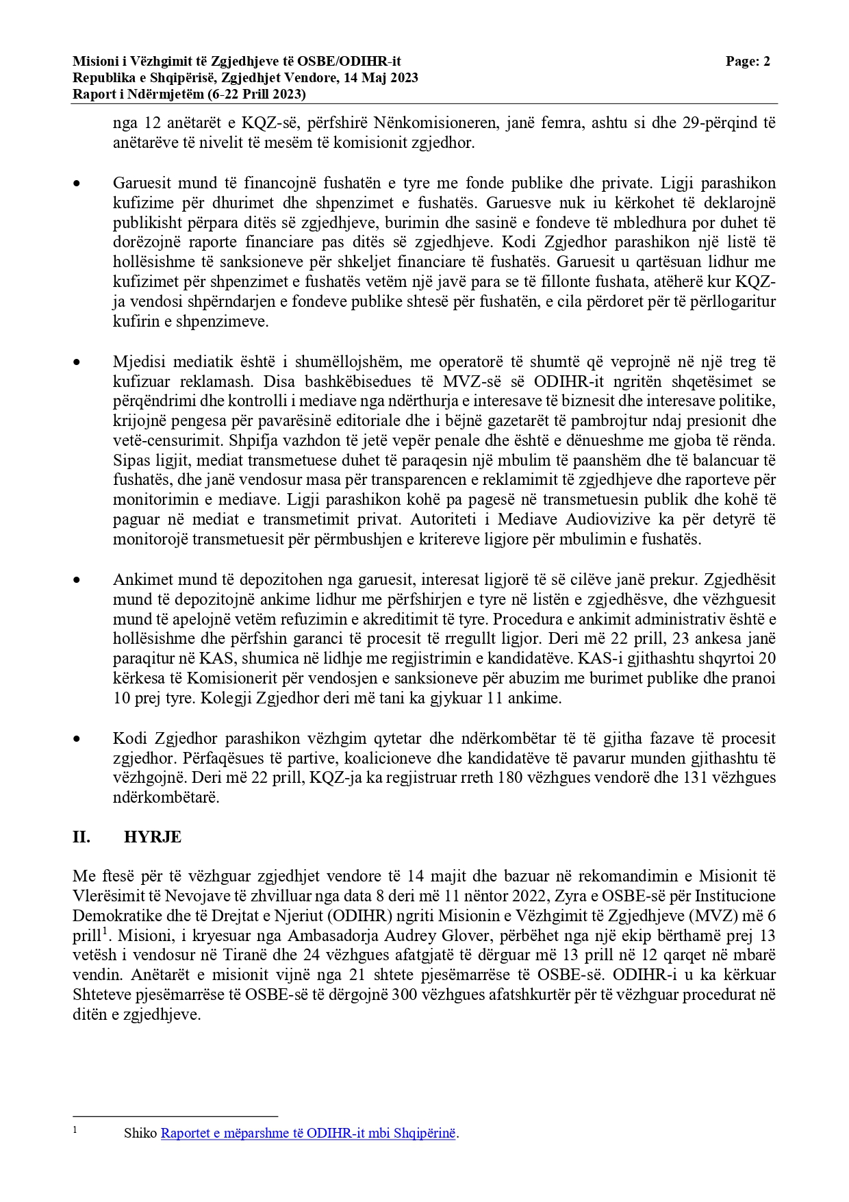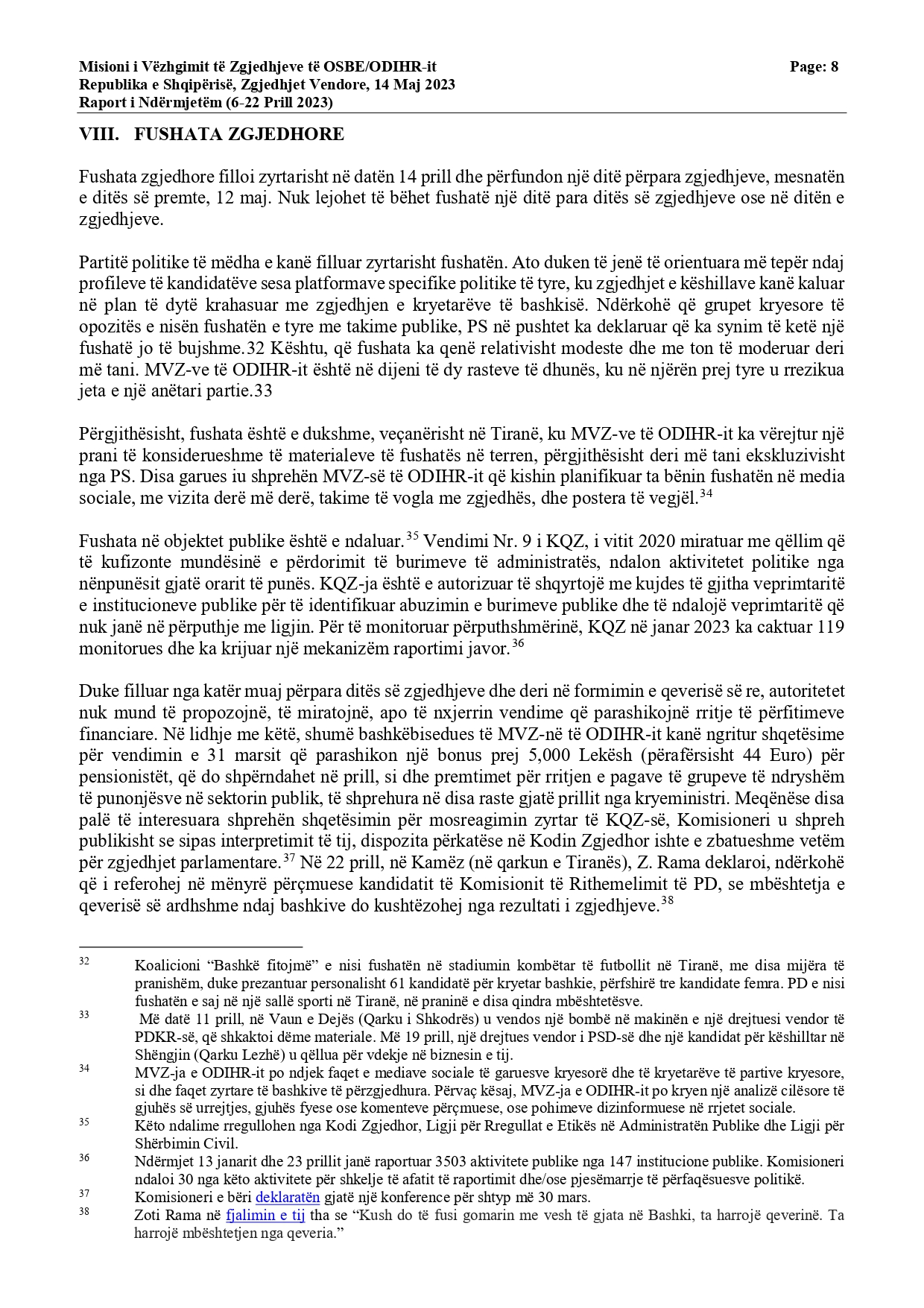 “Periudha 30 ditore e fushatës filloi më 14 prill dhe është veçanërisht e dukshme në Tiranë. Deri më tani, fushata nuk ka qenë e bujshme, dhe përgjithësisht ka pasur një ton të moderuar. MVZ-ja e ODIHR-it është në dijeni të dy rasteve të dhunës, në njërën prej të cilave u rrezikua jeta e një anëtari partie. Ndryshimet e fundit paraqitën masa të tjera mbrojtëse kundër abuzimit me burimet shtetërore. Megjithatë, shumë bashkëbisedues të MVZ-së së ODIHR-it ngritën shqetësime lidhur me iniciativat e fundit të ndërmarra nga qeveria, siç është bonusi i pensionistëve dhe premtimet e kryeministrit lidhur me pagat e punonjësve të sektorit publik. Komisioneri deklaroi publikisht se sipas interpretimit të tij, dispozitat ligjore përkatëse zbatohen vetëm për zgjedhjet parlamentare”, thuhet në raport.