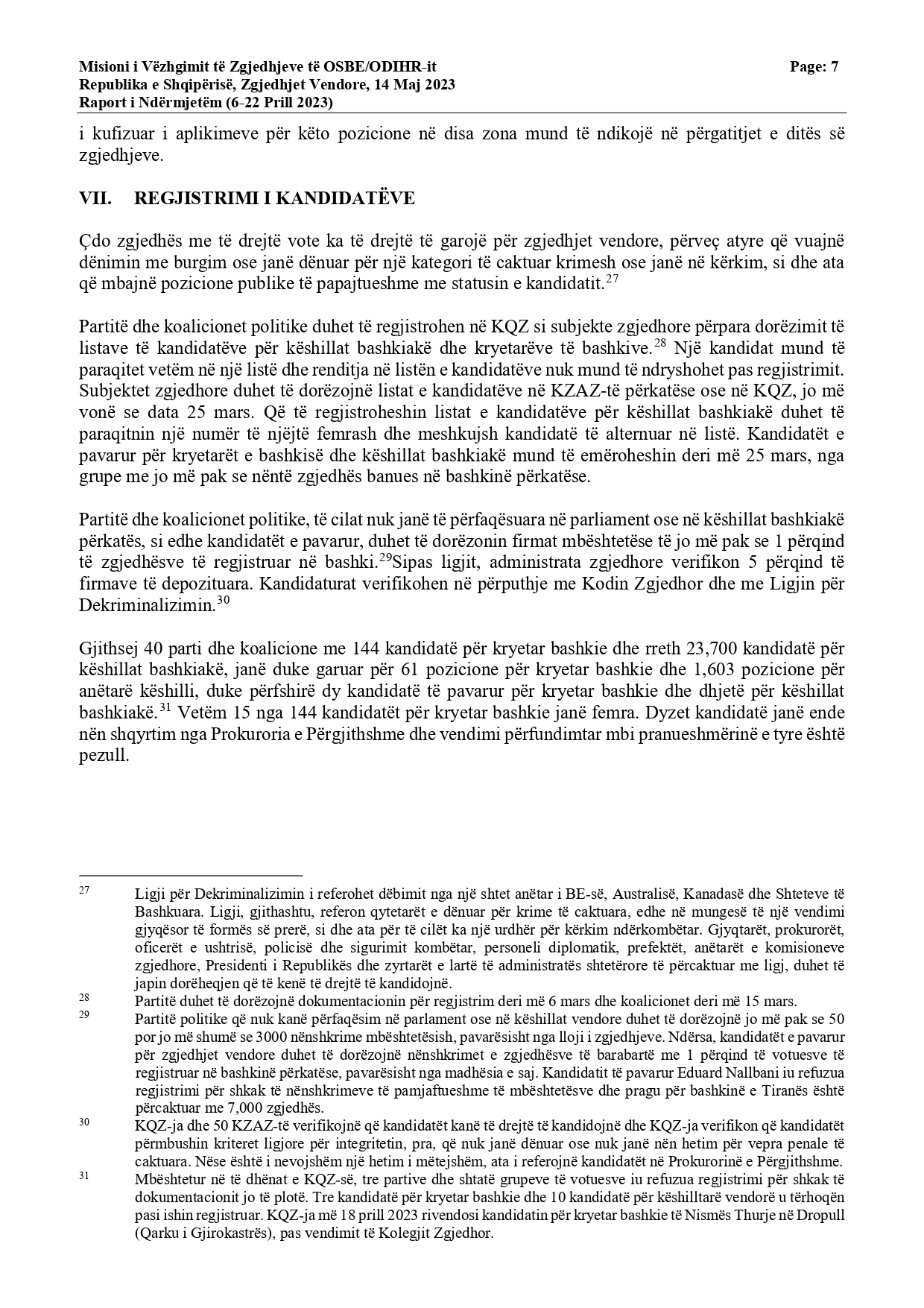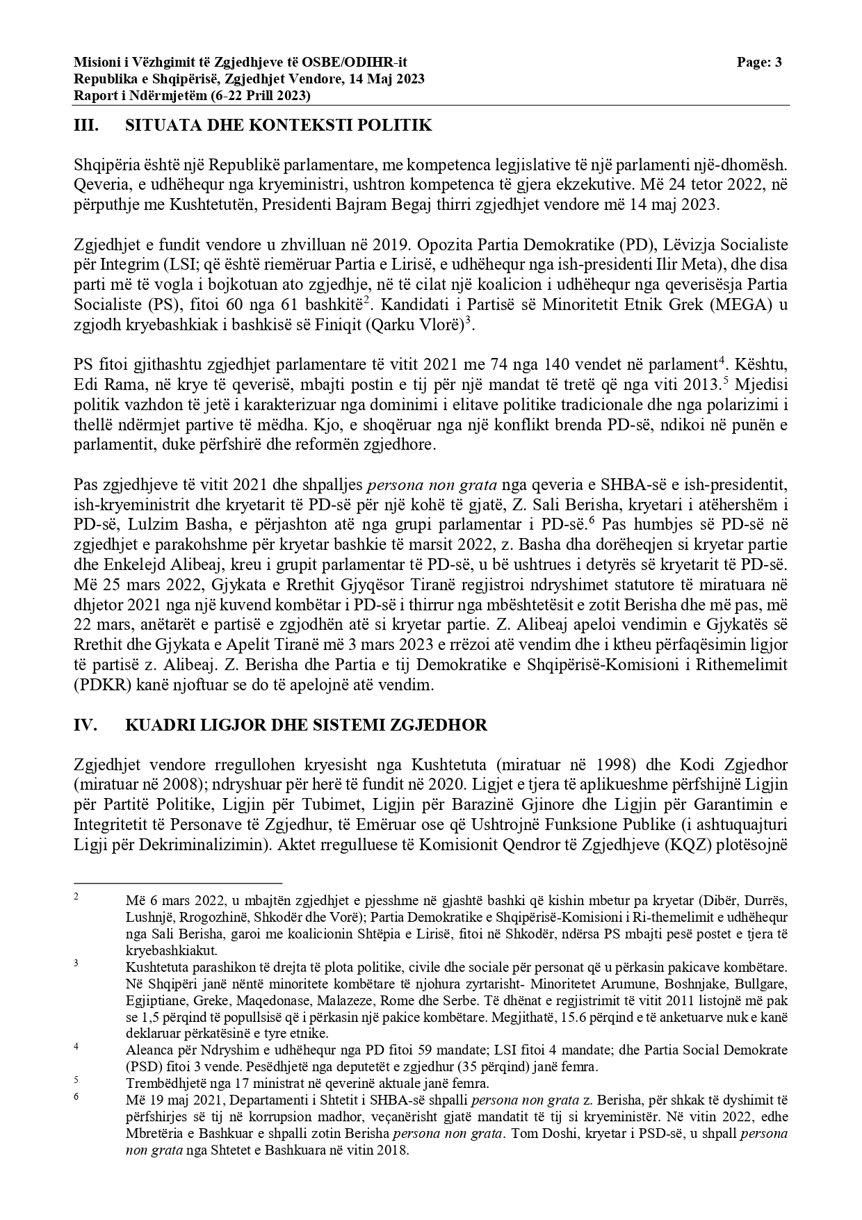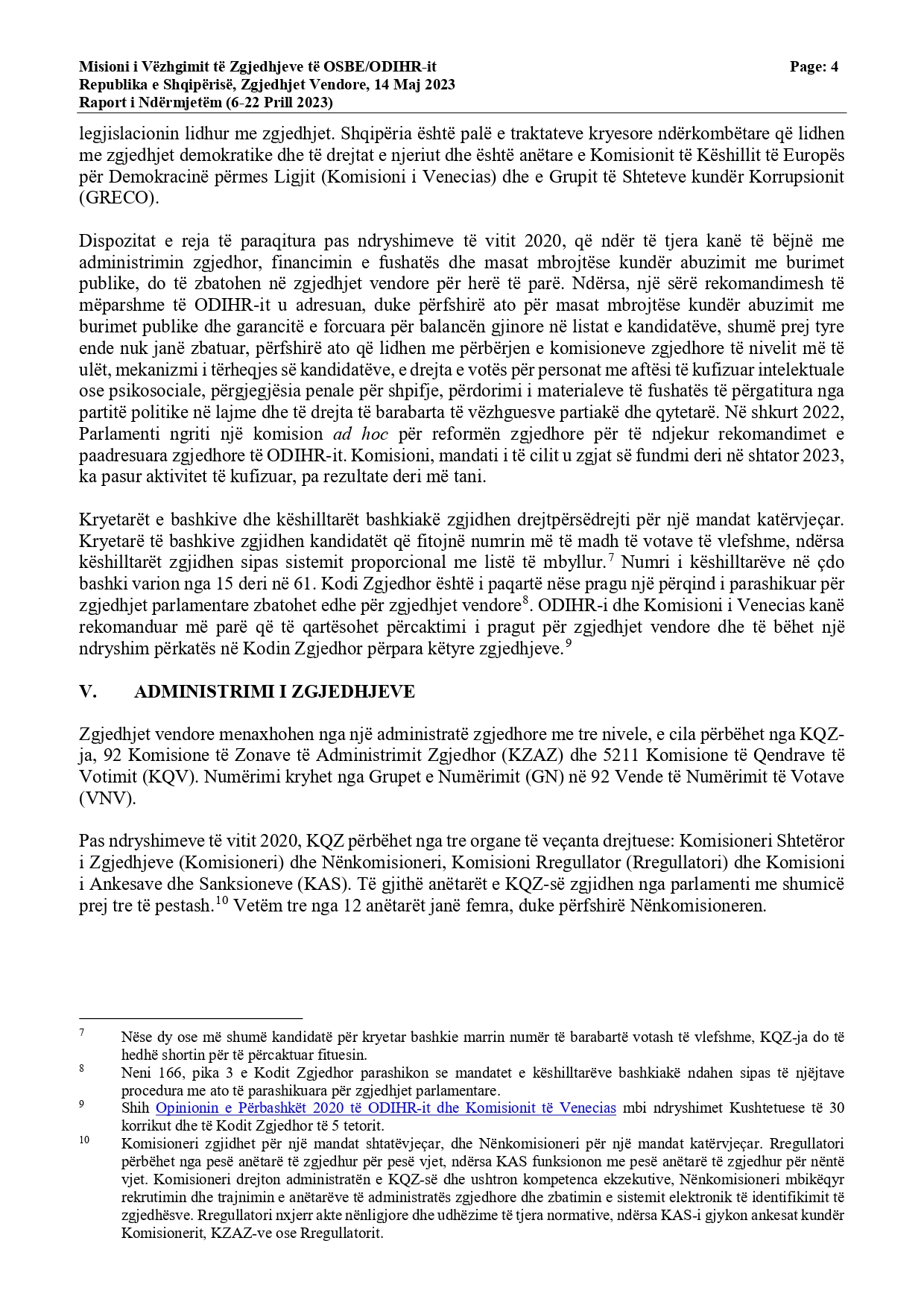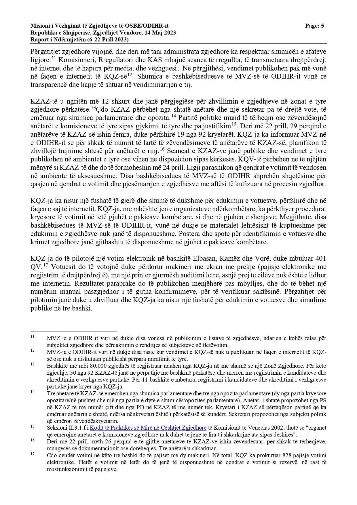 “Periudha 30 ditore e fushatës filloi më 14 prill dhe është veçanërisht e dukshme në Tiranë. Deri më tani, fushata nuk ka qenë e bujshme, dhe përgjithësisht ka pasur një ton të moderuar. MVZ-ja e ODIHR-it është në dijeni të dy rasteve të dhunës, në njërën prej të cilave u rrezikua jeta e një anëtari partie. Ndryshimet e fundit paraqitën masa të tjera mbrojtëse kundër abuzimit me burimet shtetërore. Megjithatë, shumë bashkëbisedues të MVZ-së së ODIHR-it ngritën shqetësime lidhur me iniciativat e fundit të ndërmarra nga qeveria, siç është bonusi i pensionistëve dhe premtimet e kryeministrit lidhur me pagat e punonjësve të sektorit publik. Komisioneri deklaroi publikisht se sipas interpretimit të tij, dispozitat ligjore përkatëse zbatohen vetëm për zgjedhjet parlamentare”, thuhet në raport.