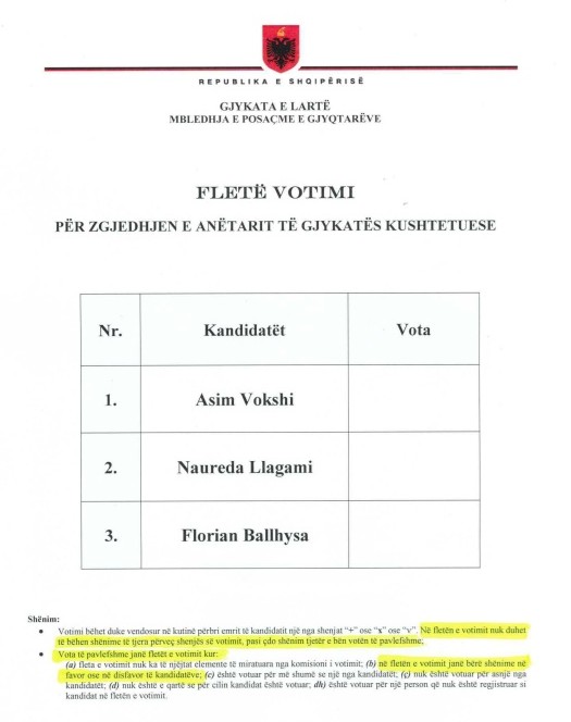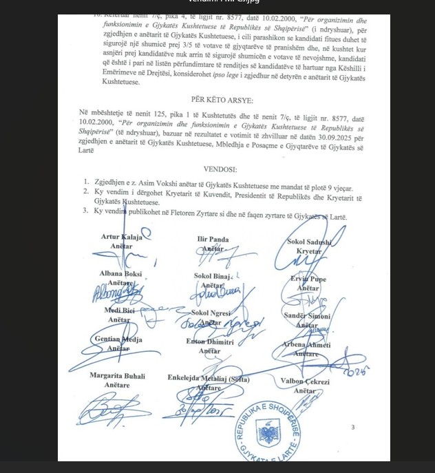 Në mungesë të shumicës së 3/5 të votave, në zbatim të nenit 7/ç të ligjit nr. 8577/2000, kandidati i renditur i pari nga Këshilli i Emërimeve në Drejtësi, z. Asim Vokshi, u shpall ipso lege anëtar i Gjykatës Kushtetuese, me vendimin unanim të Gjykatës së Lartë, i botuar në Fletoren Zyrtare nr. 177, datë 2.10.2025. Pas këtij vendimi vijohet me procedurën e betimit para Presidentit të Republikës.