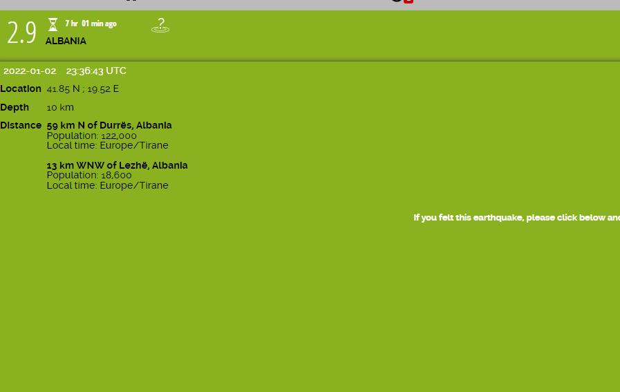 Lëkundje e parë sizmike për vitin e ri 2022 është ndjerë në orën 23:36 ndërsa epiqendra ka qenë në Lezhë.