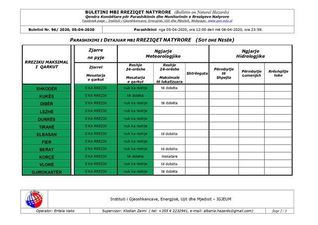 Sipas Institutit të Gjeoshkencave, Energjisë, Ujit dhe Mjedisit, temperaturat maksimale do të shënohen në vendet e ulëta 18 gradë celcius, ndërsa temperaturat minimale në vendet malore 2 gradë celcius.