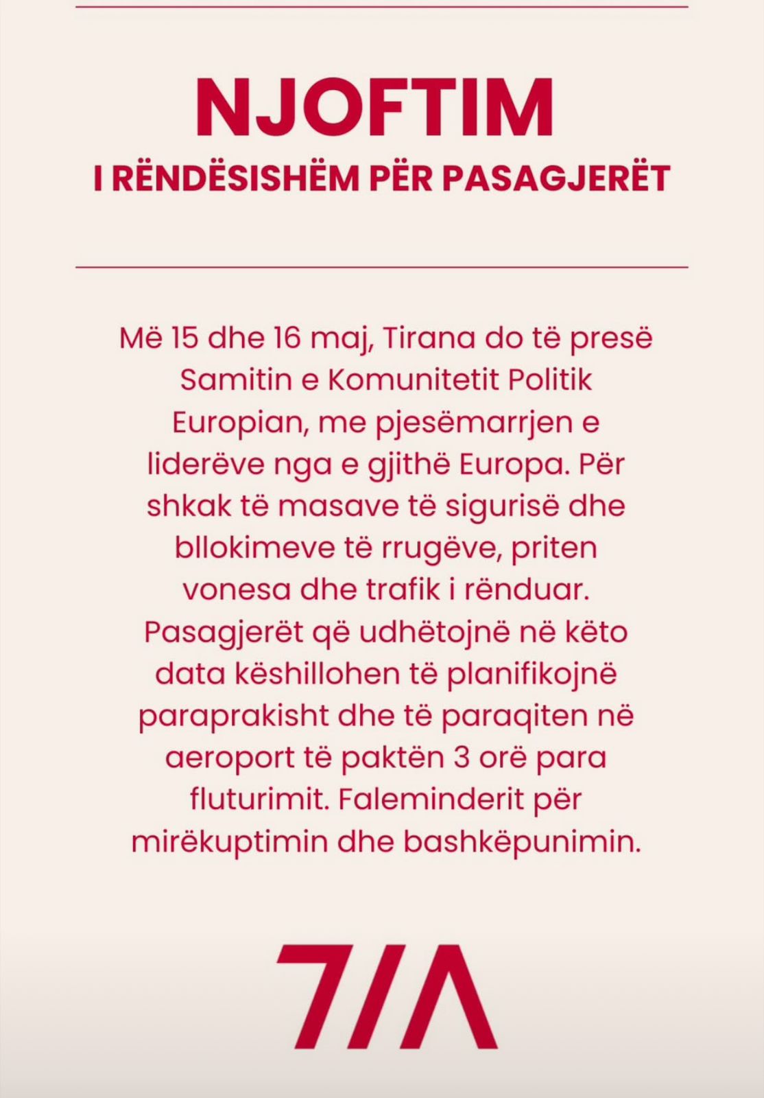 Më 15 dhe 16 maj, Tirana do të presë Samitin e Komunitetit Politik Europian, me pjesëmarrjen e liderëve nga e gjithë Europa. Për shkak të masave të sigurisë dhe bllokimeve të rrugëve, priten vonesa dhe trafik i rënduar, Aeroporti Ndërkombëtar “Nënë Tereza” këshillon pasagjerët që udhëtojnë në këto data që të planifikojnë paraprakisht dhe të paraqiten në aeroport të paktën 3 orë para fluturimit.