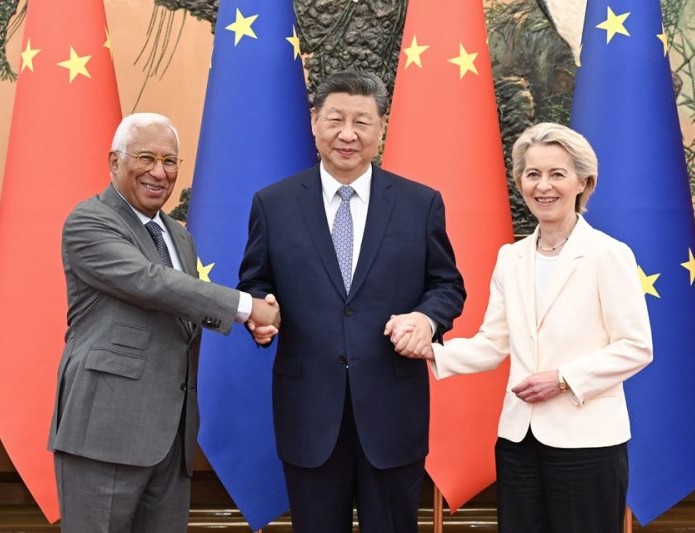 Në një pritje solemne në Pallatin e Madh të Popullit në Pekin, presidenti Xi Jinping mirëpriti presidentin e Këshillit Evropian, António Costa, dhe presidenten e Komisionit Evropian, Ursula von der Leyen. Gjatë fjalës së tij, presidenti Xi Jinping theksoi se marrëdhëniet Kinë-BE ndodhen në një pikë kyçe historike, duke vlerësuar arritjet e frytshme në bashkëpunimin dhe shkëmbimet ndërmjet të dyja palëve gjatë pesë dekadave të fundit. Ai nënvizoi se këto zhvillime kanë sjellë përfitime jo vetëm për Kinën dhe Evropën, por edhe për mbarë botën.