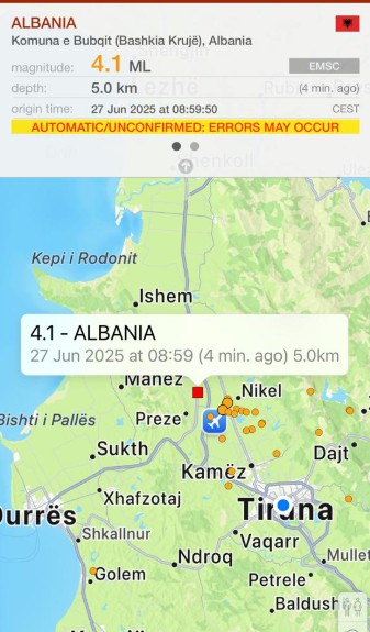 Ndihen sërish lëkundje të forta tërmeti në Tiranë. Vendndodhja e tërmetit duket se ka qenë në Larushk të Fushë Krujës, aty ku lëkundje të tokës kishte edhe pak ditë më parë me 4.4 ballë.