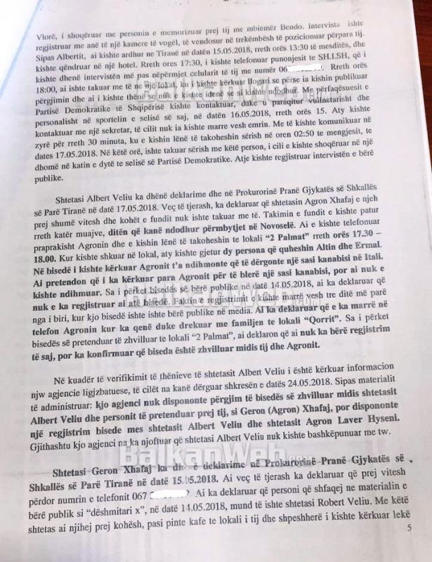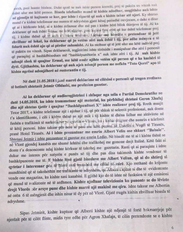 “Shtetasi Albert Veliu ka dhënë deklarime dhe në Prokurorinë pranë Gjykatës së Shkallës së Parë Tiranë në datë 17.05.2018. Veç të tjerash ka deklaruar që shtetasin Agron Xhafaj e njeh prej shumë vitesh dhe kohët e fundit nuk ishte takuar me të. Takimin e fundit e kishte pasur rreth para katër muajve, ditën që kanë ndodhur përmbytjet në Novoselë. Ai e kishte telefonuar paraprakisht Agronin dhe e kishin lënë të takoheshin tek lokali “2 P***” rreth orës 17:30-18:00. Kur kishte shkuar në lokal, aty kishte gjetur dy persona që quheshin Altin dhe Ermal.