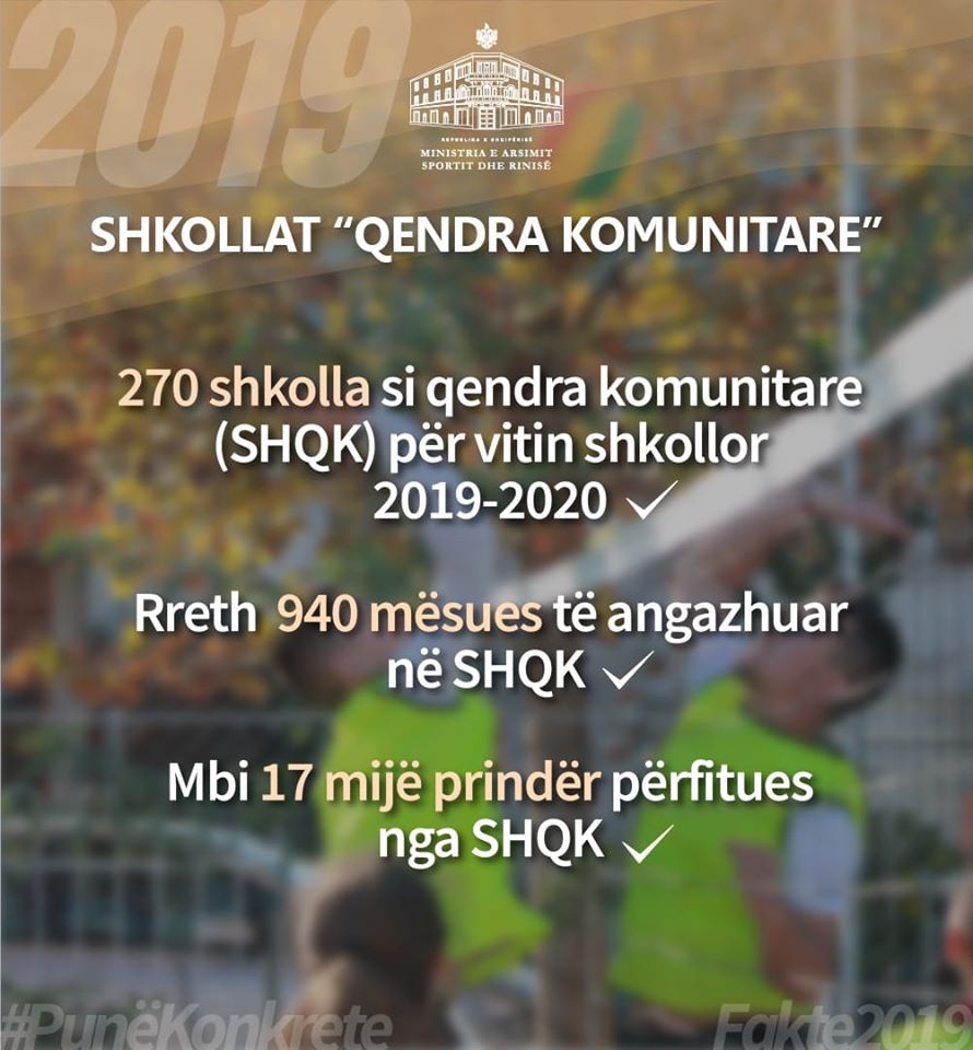 ”Shkollat si qendër komunitare”, u ka mundësuar nxënësve të mund të përdorin mjediset e shkollave për kurse të avancuara, edhe pas orarit të mësimit. Ministria e Arsimit, Sportit dhe Rinisë, ka bërë të ditur se janë 270 shkolla të cilat kanë shërbyer si qendër komunitare për vitin shkollor 2019-2020. Referuar shifrave të publikuara nga ministria Arsimit thuhet se janë rreth 940 mësues të angazhuar në këto shkolla si dhe mbi 17 mijë prindër përfitues.