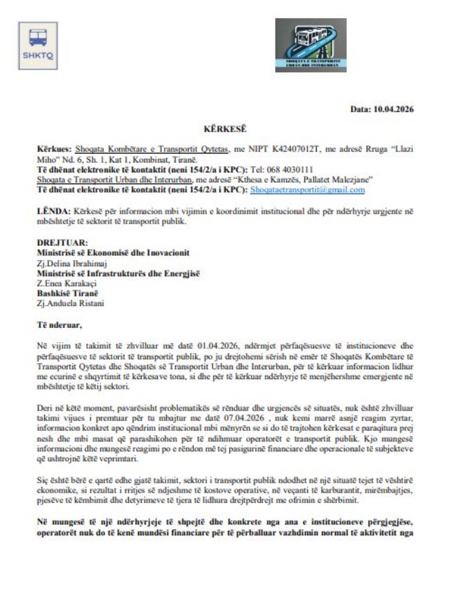 Shoqata e Transportit Qytetas dhe Shoqata e Transportit Urban dhe Interurban i janë drejtuar ditën e sotme me një tjetër letër ministrave të Ekonomisë, Delina Ibrahimaj, dhe ministrit të Infrastrukturës dhe Energjisë, Enea Karakaçi, duke i kërkuar ndërhyrje urgjente për dhënie të kompensimit.