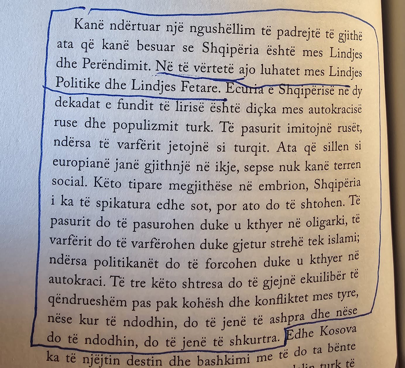 Një mik më çoi sot një paragraf nga eseja ime Hëna e Shqipërisë që merr përsipër të parashikojë Shqipërinë në 20 apo 50 vjet. Shumë prej parashikimeve të kanë dalë, më tha ai miku, por sidomos ky paragraf e përshkruan më mirë se çdo gjë gjendjen ku jemi sot.