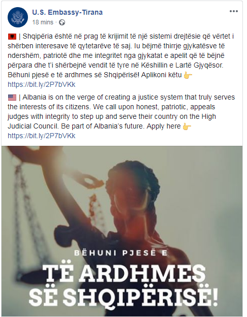 “Shqipëria është në prag të krijimit të një sistemi drejtësie që vërtet i shërben interesave të qytetarëve të saj. Iu bëjmë thirrje gjykatësve të ndershëm, patriotë dhe me integritet nga gjykatat e apelit që të bëjnë përpara dhe t’i shërbejnë vendit të tyre në Këshillin e Lartë Gjyqësor. Bëhuni pjesë e të ardhmes së Shqipërisë! Aplikoni këtu ? https://bit.ly/2P7bVKk ”, shkruan ambasada amerikane.