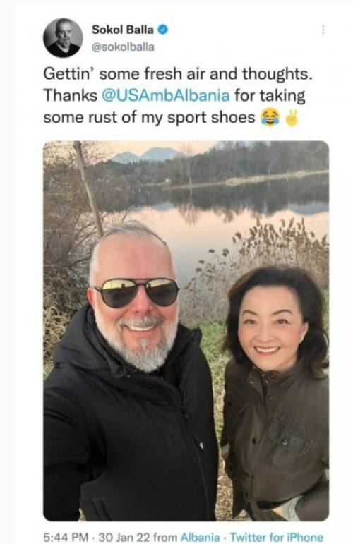 Sokol Balla poston foto me ambasadoren amerikane. Kim: “Faleminderit për shëtitjen dhe diskutimin freskues”