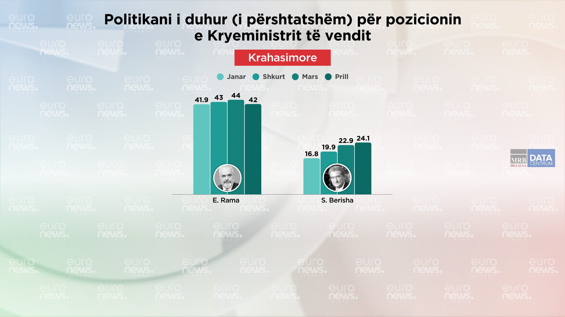 42 % e qytetarëve thonë se më i përshtatshmi për kryeministër është Edi Rama. Pas tij me radhë 24.1% Sali Berisha, 8.6% Adriatik Lapaj, 7.6% Agron Shehaj, 2.1% Arlind Qori, 1.1% Elena Kocaqi, 1% Tom Doshi dhe 10.6% janë përgjigjur nuk e di.