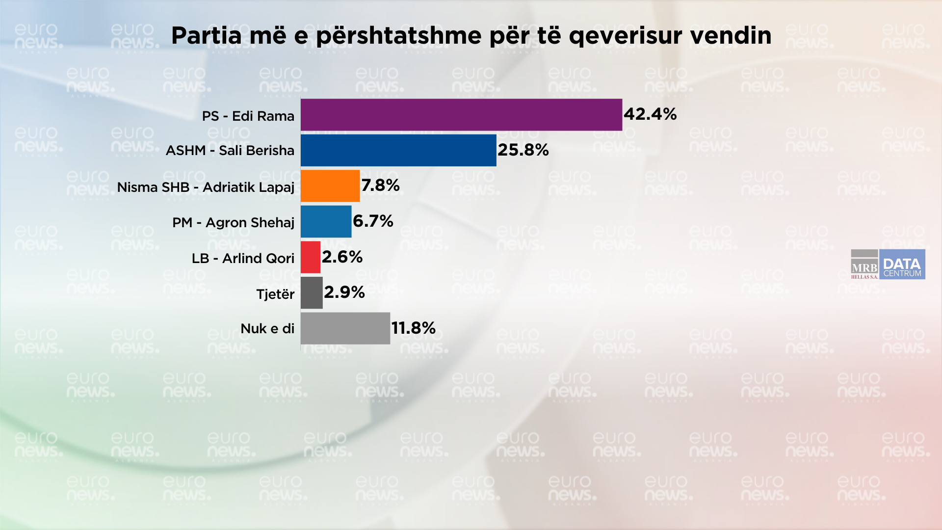 42.4% e qytetarëve shprehen se është Partia Socialiste, 25.8% Partia Demokratike dhe koalicioni saj, 7.8% Nisma Shqipëria Bëhet, Partia Mundësia 6.7%, 2.6% Lëvizja Bashkë, 2.9% tjetër dhe 11.8% janë përgjigjur nuk e di.