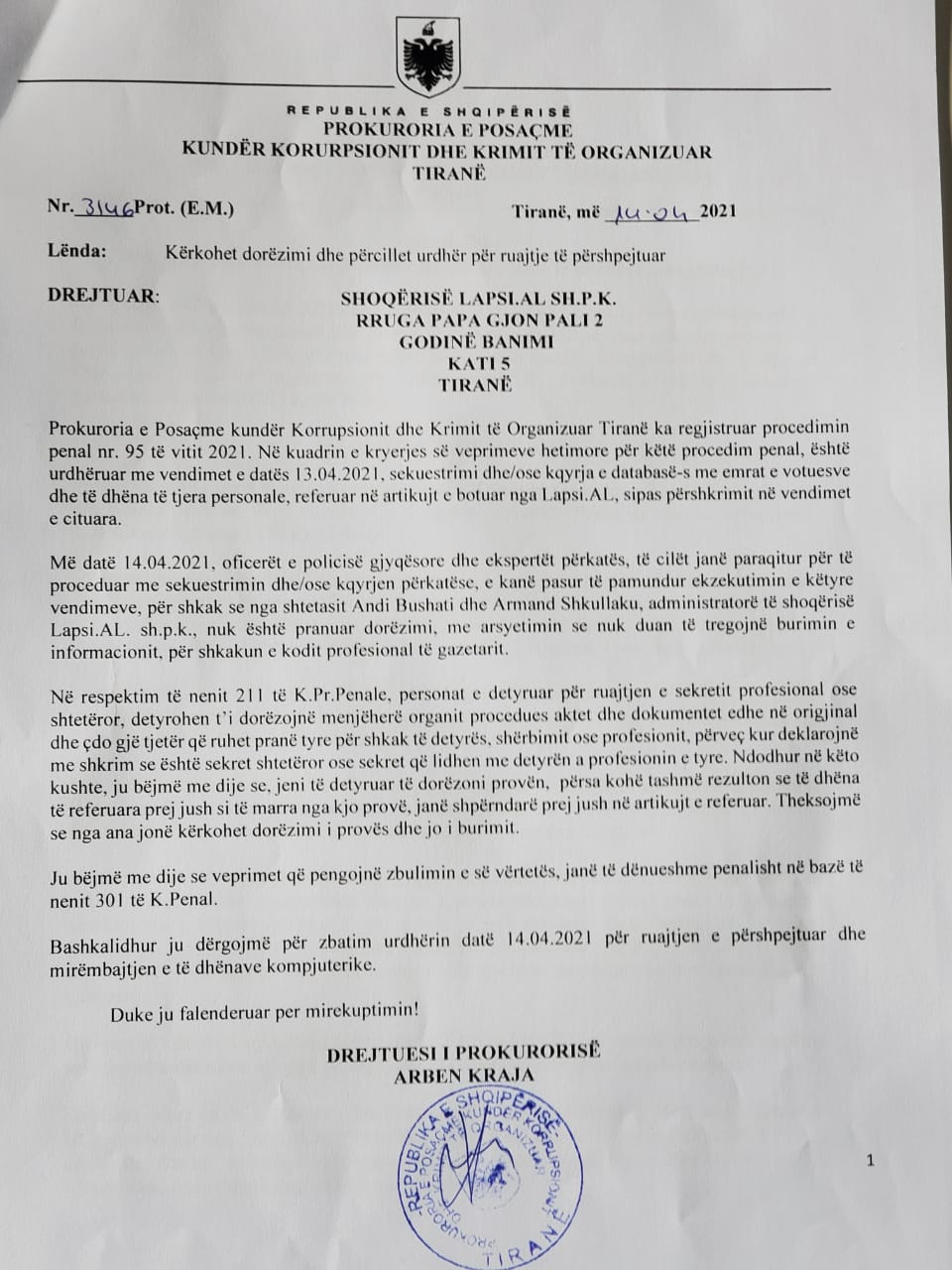 NË FOTO/Dokumenti i SPAK për gazetarët dhe drejtuesit e Lapsi.al