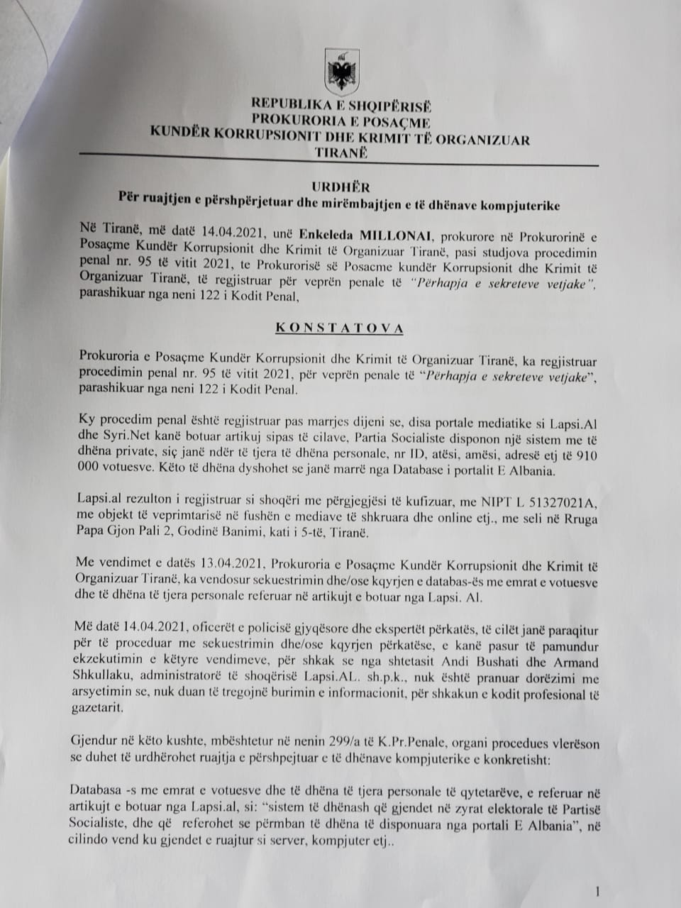 SPAK ka kërkuar bllokimin e serverit të Lapsi.al për një periudhë disamujore, me qëllim hetimin e dokumenteve dhe publikimet që janë bërë nga gazetarët për dosjen e të dhënave që përdorte Partia Socialiste për të ndikuar të votuesit.