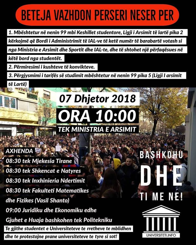 Ata kërkojnë edhe plotësimin e tre kërkesave të tjera, ku renditen përgjysmimi i tarifës së studimeve, përmirësimi i kushteve në konvikte si dhe që Bordi i Arsimit të Lartë të ketë numër të barabartë votash si ministria e Arsimit.