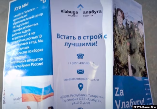 Autoritetet ruse po shpërndajnë materiale promocionale dhe rekrutuese për Politeknikumin Alabuga në shkollat në Kirgizi. Në një broshurë u bëhet thirrje nxënësve: “Bashkohuni me … më të mirët”. Një fotografi e të rinjve të veshur me uniforma ushtarake premton se “do t’i trajnojë [studentët] për t’u bërë specialistët më të mirë të montimit të dronëve për nevojat e ushtrisë ruse”. Në faqen e parë të broshurës shfaqet një dronë, bashkë me simbolet ushtarake proruse “Z” dhe “V”.