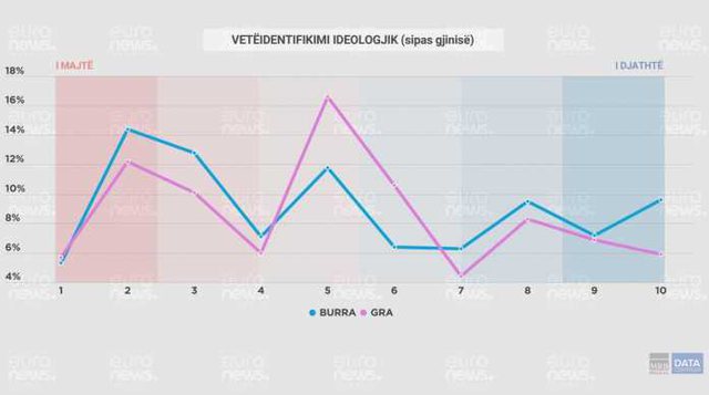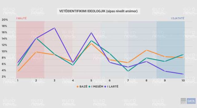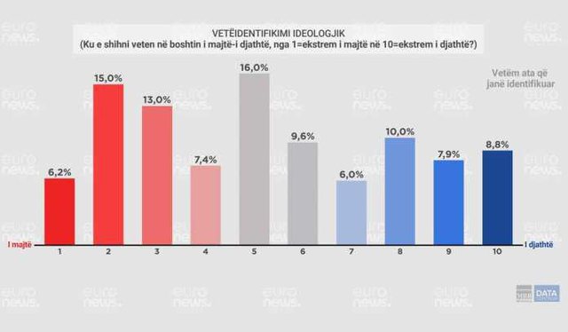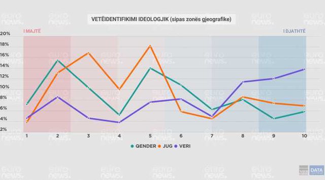 Veriu i Shqipërisë banohet nga pjesa më e madhe e shqiptarëve me bindje të ekstremit të djathtë. Në jug mbizotërojnë qytetarët me bindje të të majtës liberale dhe në Shqipërinë e mesme ata të ekstremit të majtë. Gjetjet janë të anketës së Barometrit në Euronews Albania, kryer nga MRB dhe DataCentrum në nivel kombëtar me 1000 intervista ballë për ballë në familje mes datave 25 prill dhe 7 maj.
