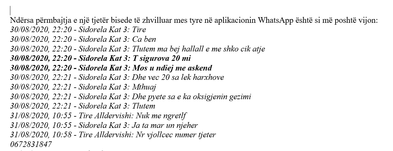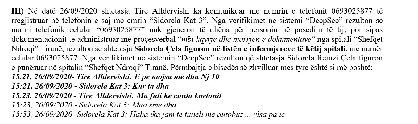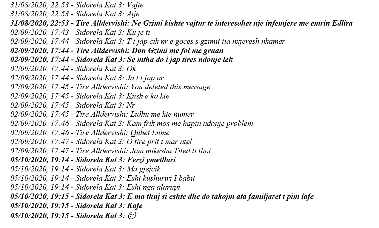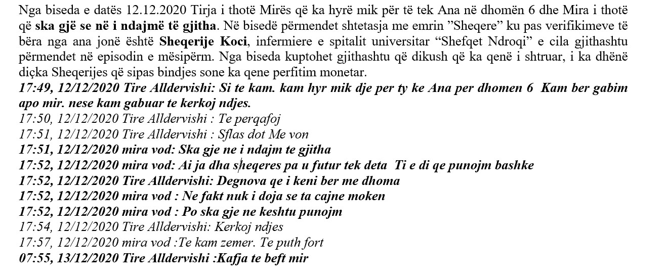 Pas lajmit për arrestime të reja në spitalin ”Shefqet Ndroqi” në lidhje me rastin ”Tire”, kanë dalë edhe bisedat mes personelit të spitalit Covid 2 “Shefqet Ndroqi” për rastin e sanitares Tire Alldervishi, e cila mori para nga familjarët e një pacienteje me Covid-19 që më pas ndërroi jetë.