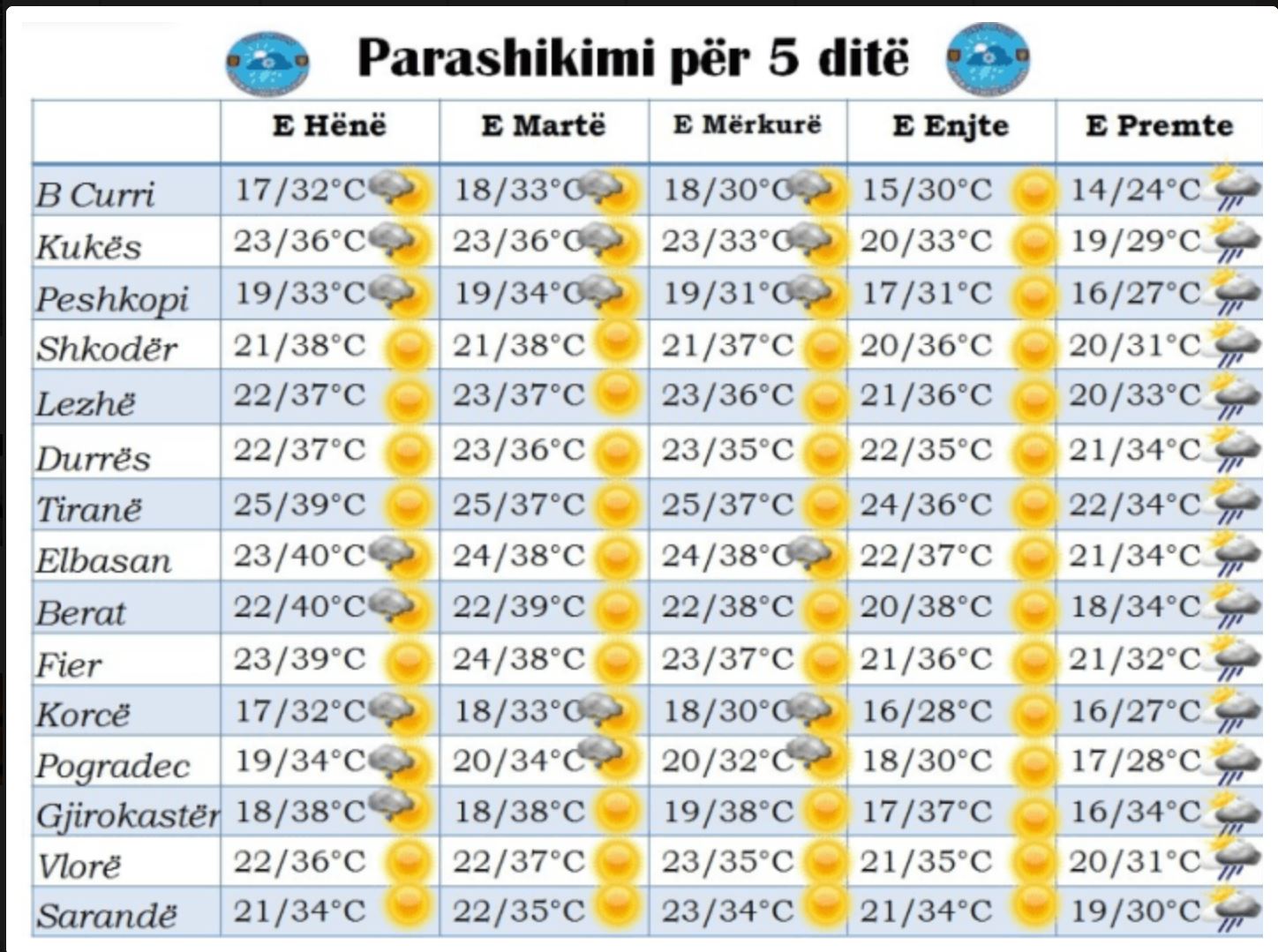 Për tu theksuar janë disa fakte: ditët më të nxehta të kësaj jave do të jenë ajo e Hënë dhe pjesërisht ajo e Martë më pas pritet rënie graduale e temperaturave në vlerat e mesditës.