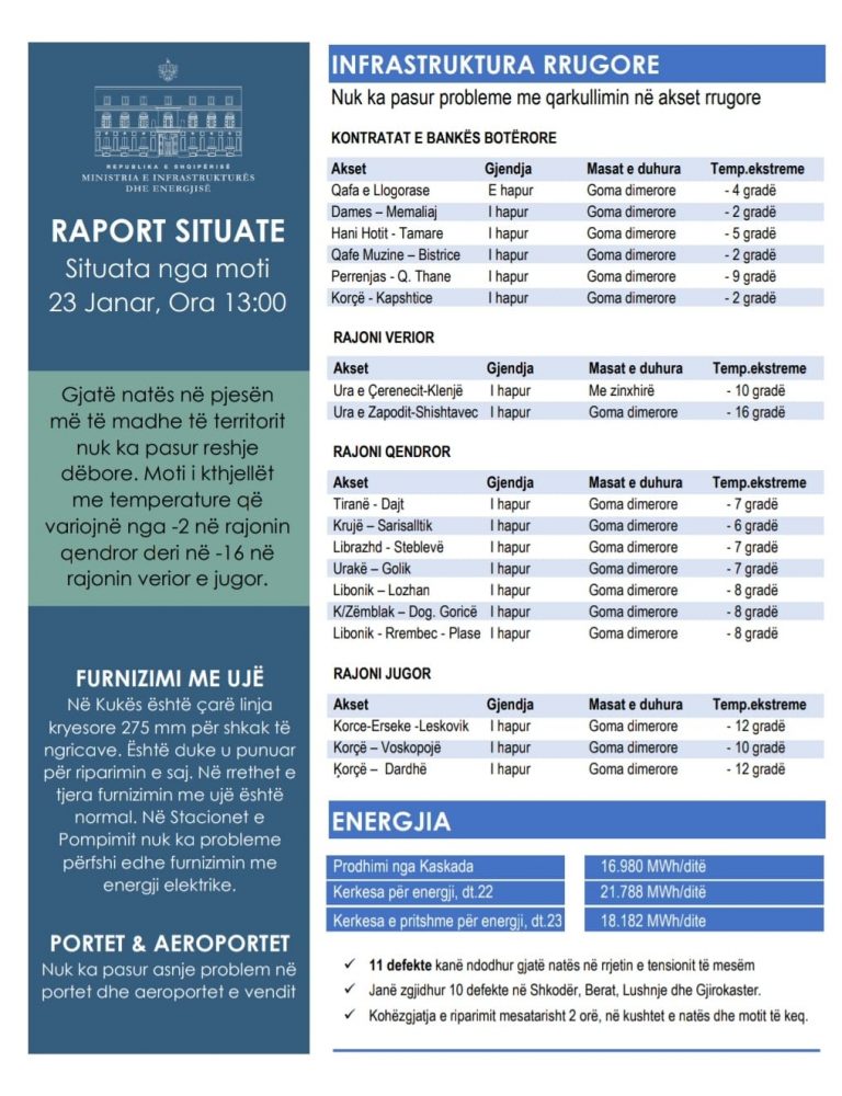 Ndërsa gjatë natës, në pjesën më të madhe të territorit nuk ka pasur reshje dëbore. Sa i përket furnizimit me ujë, në Kukës është çarë linja kryesore 275 mm për shkak të ngricave.
