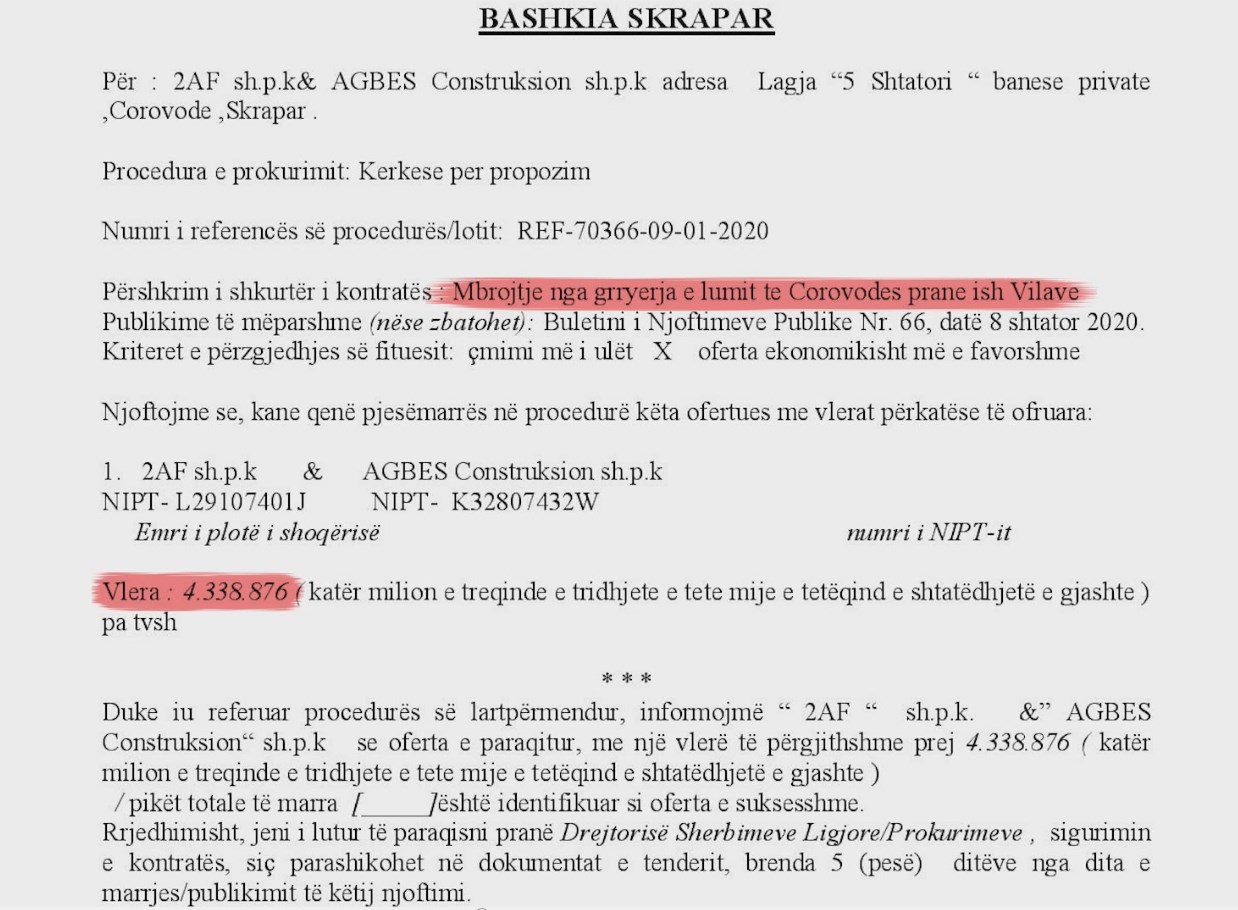 Për të siguaruar kontratën ka shfqur interes vetëm bashkimi i operatorëve 2AF shpk dhe Agbes Construction.