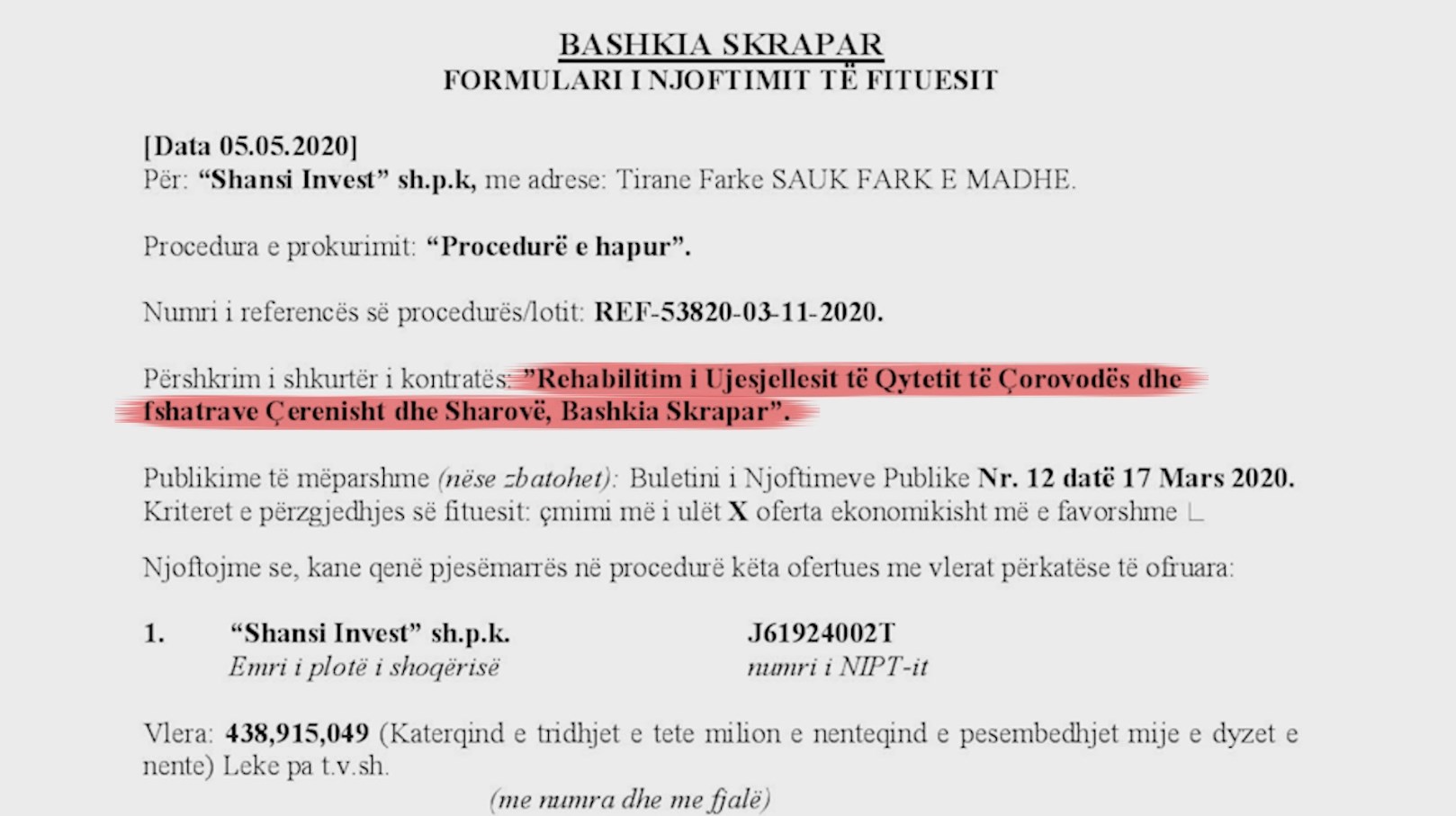 Në këtë mënyrë kontrata është nënshkruar nga Shansi Invest shpk.