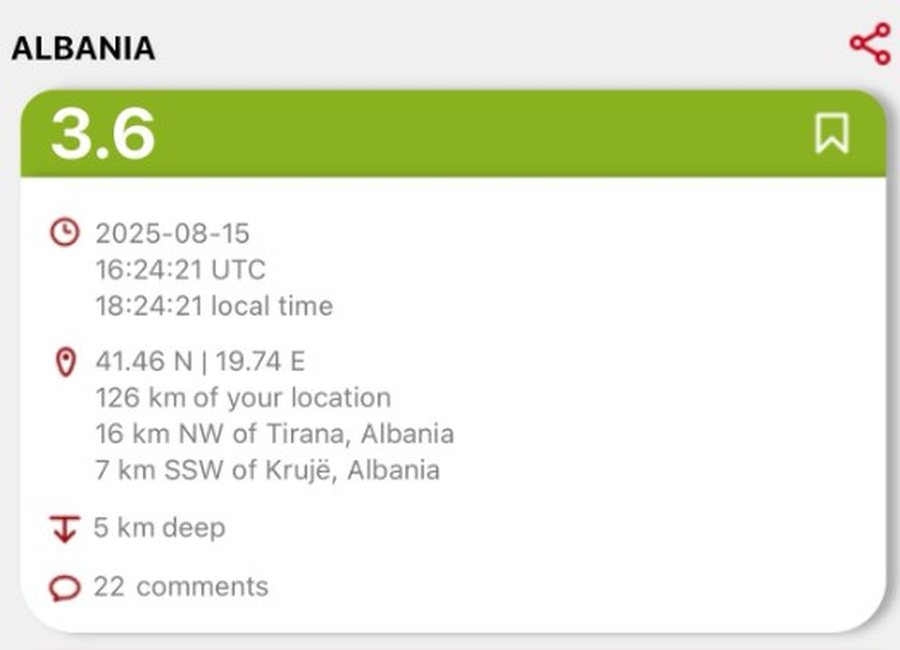 Lëkundje tërmeti janë regjistruar në vendin tonë. Lëkundjet u ndjenë të forta në Tiranë, Durrës e Krujë, rreth orës 18:20. Forca e tërmetit është 3.6 ballë dhe deri më tani nuk raportohet për dëme. Tërmeti me thellësi fokale 5 km, e kishte epiqendrën rreth 7 km në jugperëndim të Krujës.