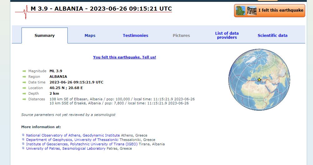 Epiqendra e tërmetit ishte në afërsi të kufirit me Greqinë, 10 km larg Ersekës.