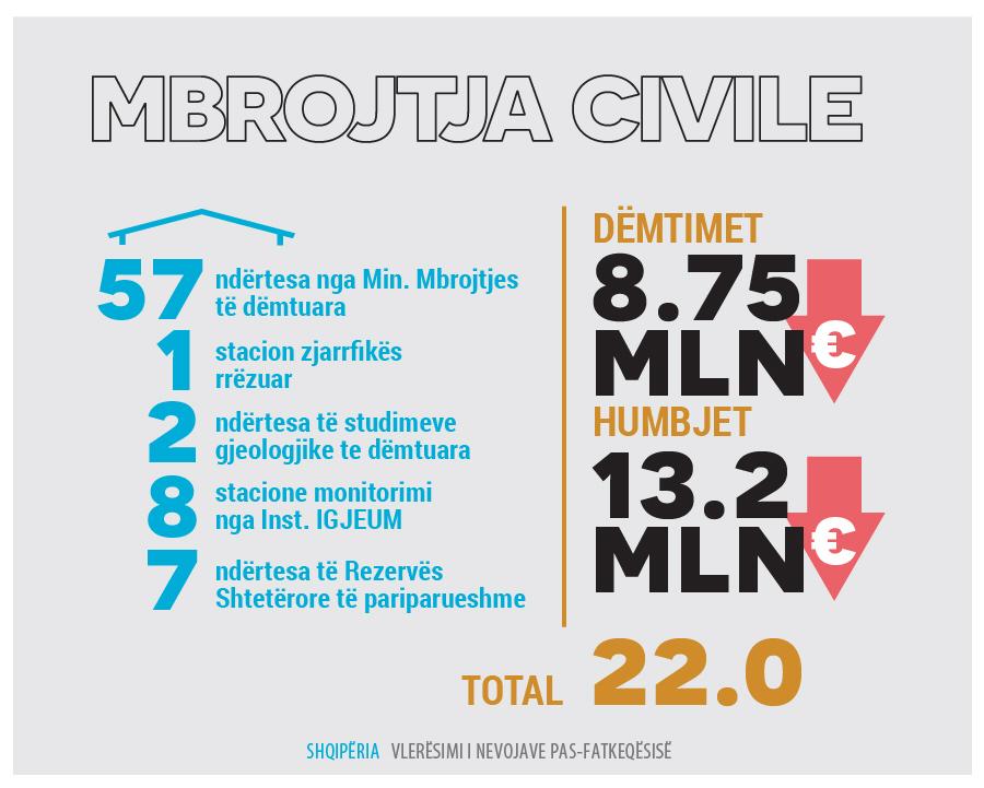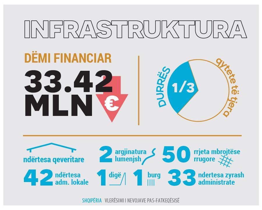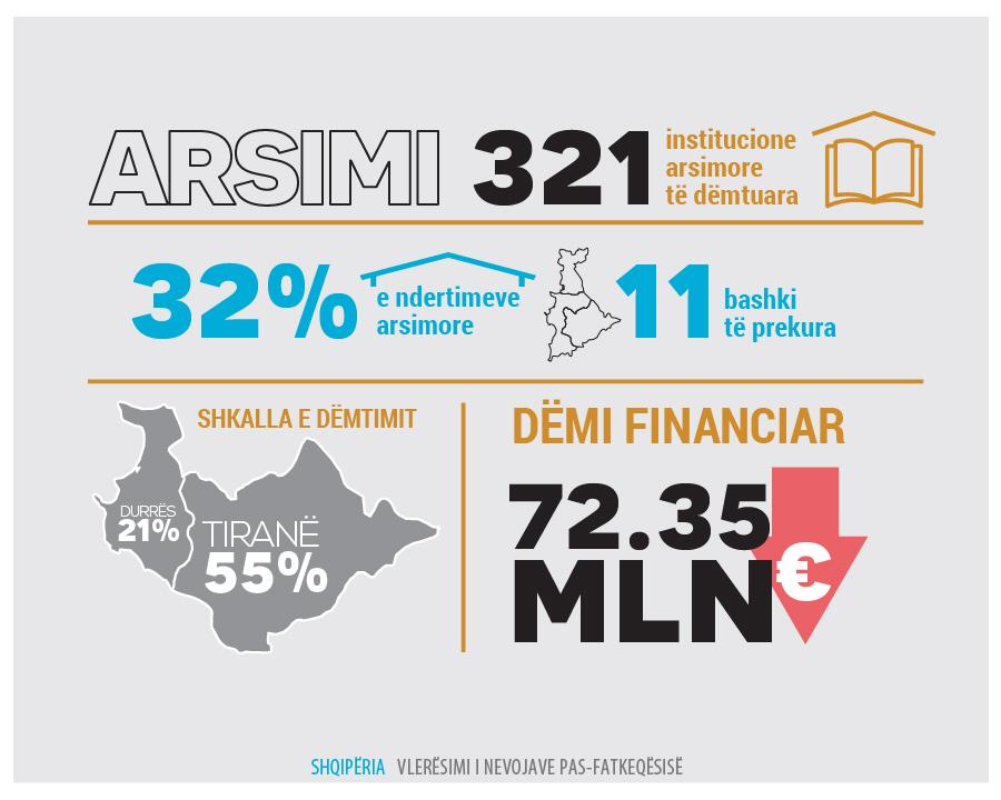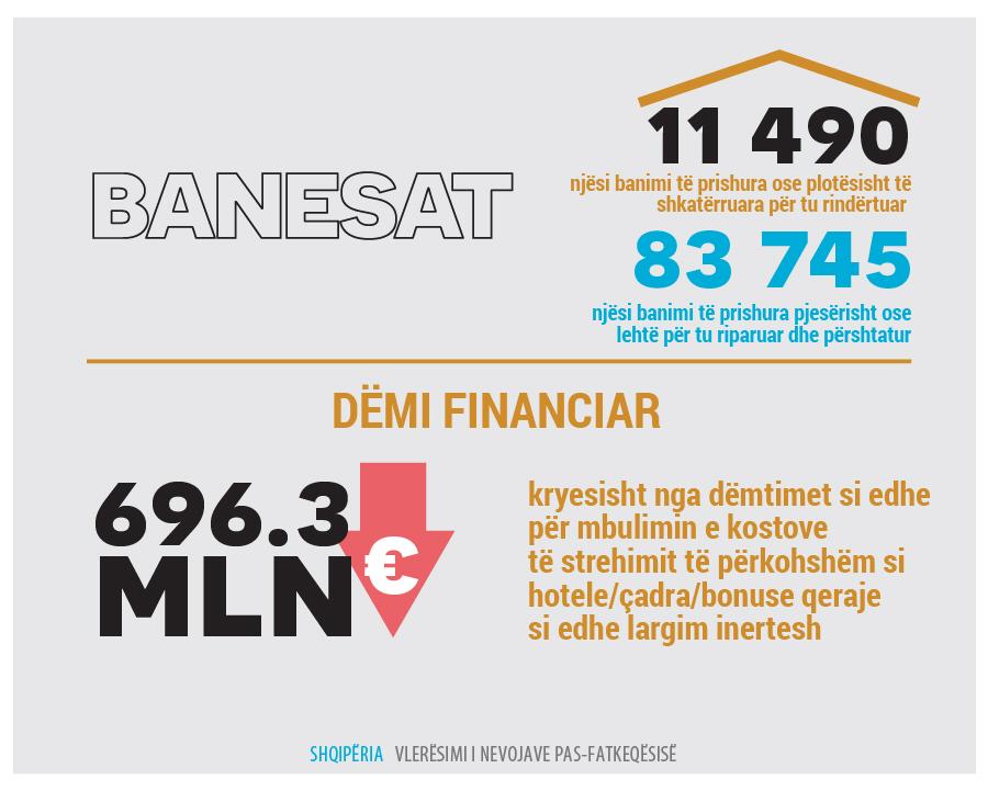 Shumica e dëmeve janë regjistruar në sektorin e banesave, pasuar nga sektori prodhues (si biznesi dhe turizmi, bujqësia dhe trashëgimia kulturore) dhe sektori arsimor. Për të adresuar efektet e dëmit dhe të ardhurave të humbura si rezultat i tërmetit, vlerësimi arriti në përfundimin se do të duheshin gati 1.08 miliardë Euro në të gjithë sektorët për rimëkëmbje. Sektorët që reflektojnë nevojat më të mëdha janë strehimi, që përfaqëson pothuajse 76% të të gjitha nevojave, pasuar nga arsimi dhe infrastruktura.