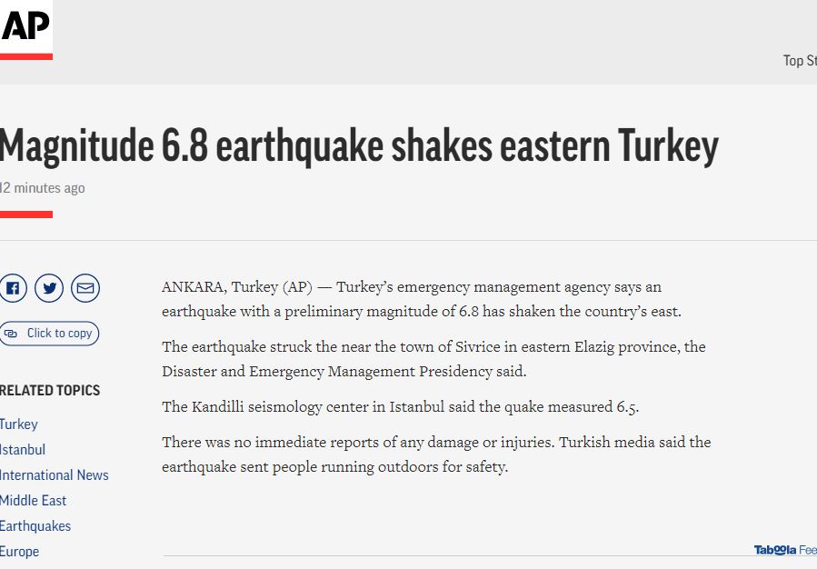 Asociated Press raporton se tërmeti ra në afërsi të qytetit Sivrice në provincën lindore Elazig, tha Agjencia e Menaxhimit të Fatkeqësive dhe Urgjencës në shtetin turk.